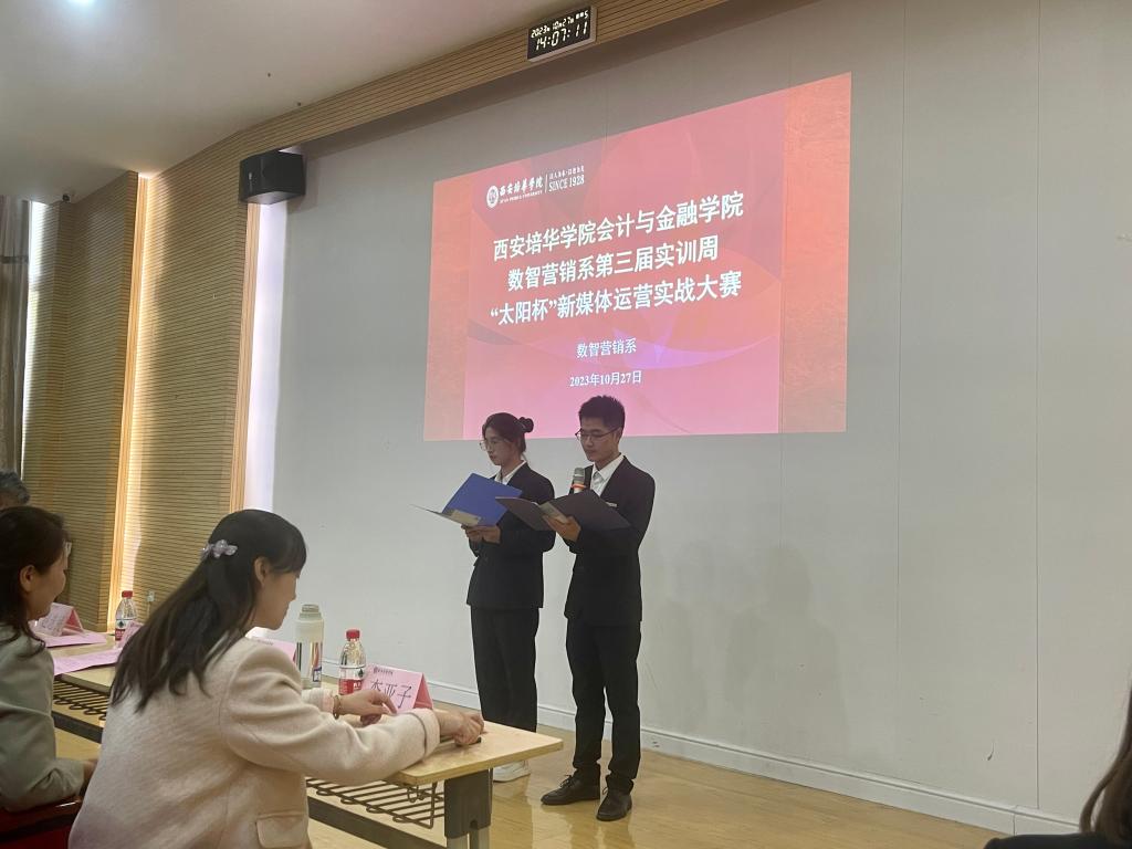西安培华学院会计与金融学院数智营销系于2023年10月27日周五下午14:00在博远楼J202举办第三届实训周“太阳杯”新媒体运营实战大赛决赛,该活动旨在推动学生在新媒体领域的创新和发展。本次比赛由市场营销专业的王静芝和庞嘉洋同学共同主持。主要参会人员有西安太阳食品有限责任公司董事、行政总监王磊峰,西安太阳食品有限责任公司电商部门相关负责人、西安培华学院会计与金融学院院长赵选民,行政副院长史立军以及副院长丁阳,数智营销系电子商务、市场营销专业全体教师和学生。此次比赛为数智营销系的学生们提供了一个展示他们数字营销技能的舞台,共同见证了这一数字时代的营销盛事。
