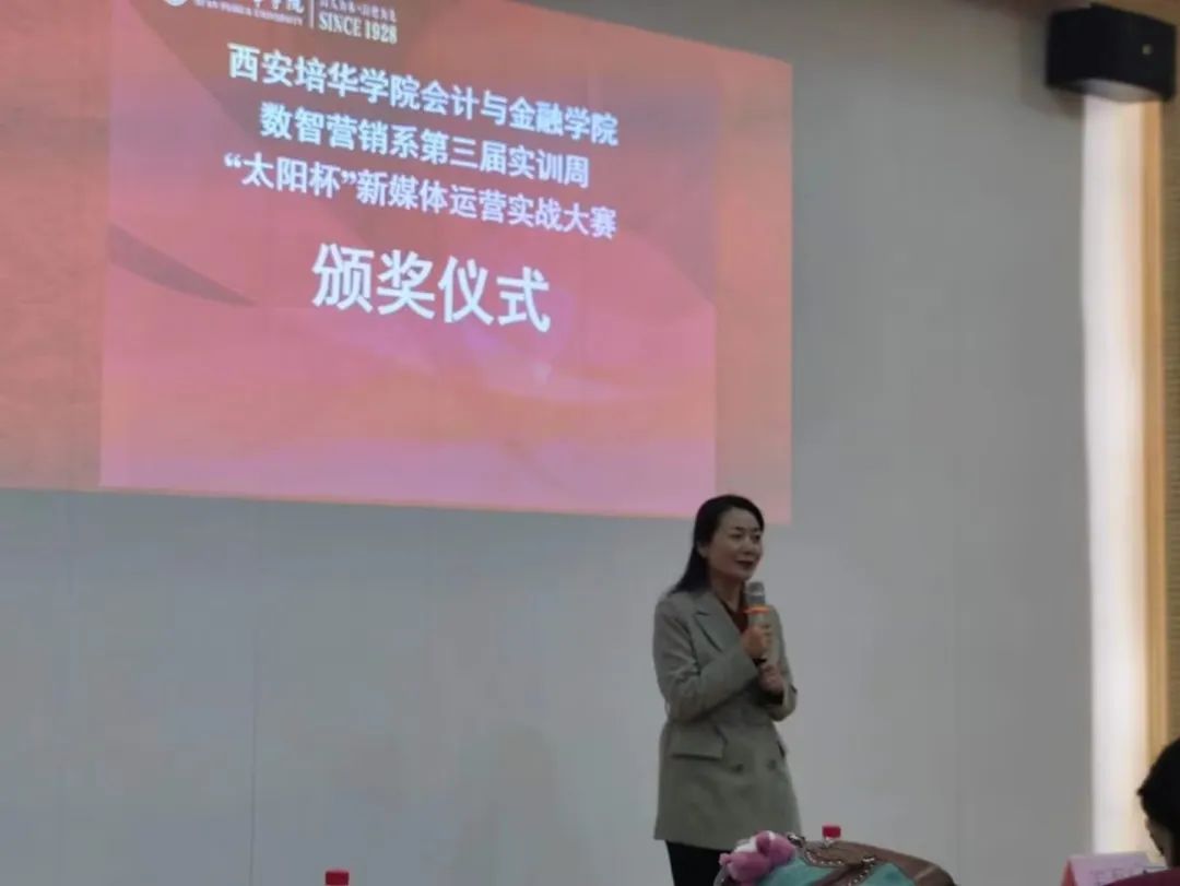 紧接着西安培华学院会计与金融学院副院长丁阳发表总结讲话,为参赛学生们送上最诚挚的祝贺。丁副院长强调了数字化营销的未来前景,强调学生们在数字时代的重要性,她鼓励他们继续追求创新、热情投身于数字营销领域。她表示:“你们是明日数字营销的领军人才,不断学习、不断挑战自己,将为未来数字经济的繁荣做出不可或缺的贡献。