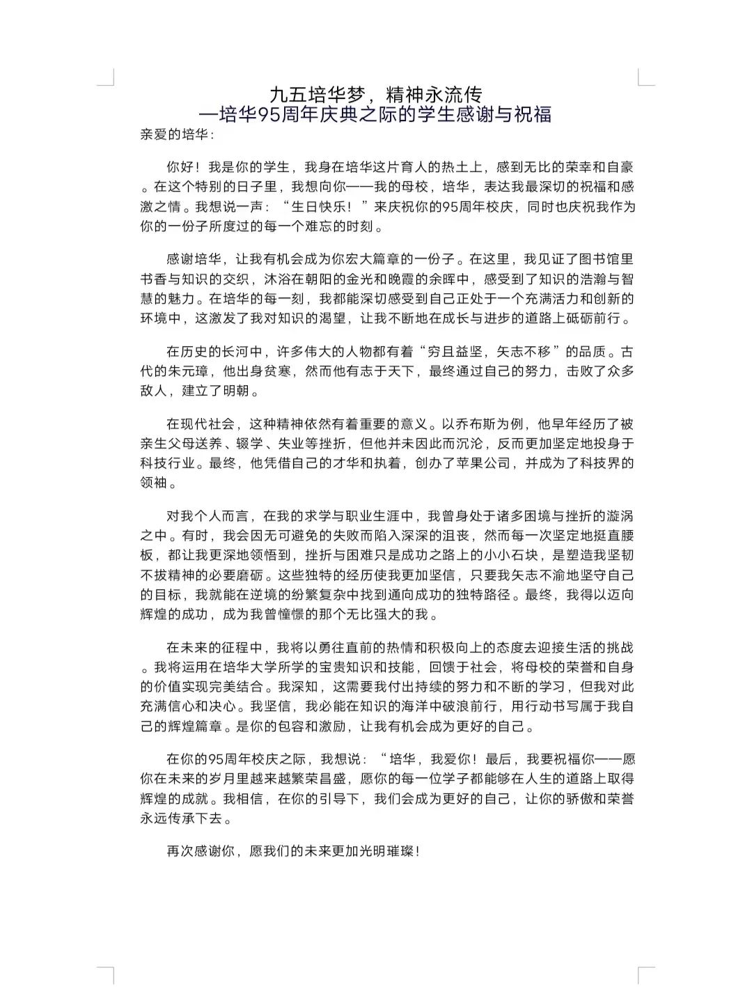 此次活动收获满满,收获了一篇又一篇的优秀征文,字里行间流露出学生们对学校九十五周年的祝福,优秀作品展示如下: