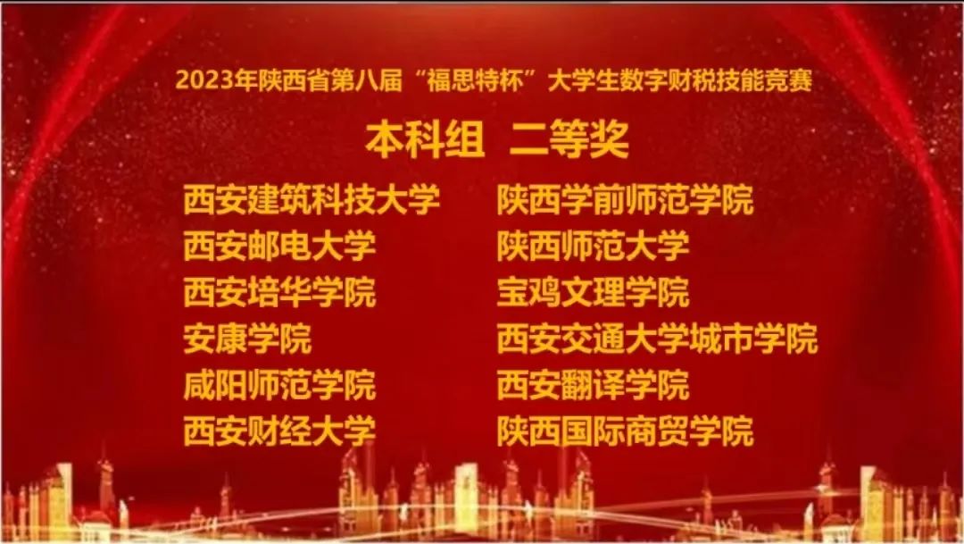 本次大赛包括财税分岗位、数字财务竞赛两个系统,竞赛以线上方式进行。经过前期宣传动员、学生报名,集中培训和院级选拔等多个环节,最终从18支校赛队伍中选拔出由李丹老师和刘杨老师共同指导的一支队伍代表我校参加省赛,并成功取得了福斯特杯陕西省各大高校联赛本科组“二等奖"的荣誉。