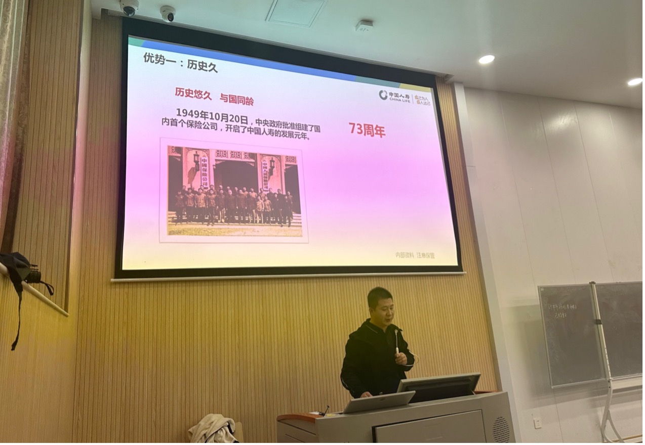 接着是中国人寿保险有限公司西安分公司,公司代表曹总详细介绍了保险行业的发展前景,以及企业的行业地位,呼吁感兴趣的学生加入!