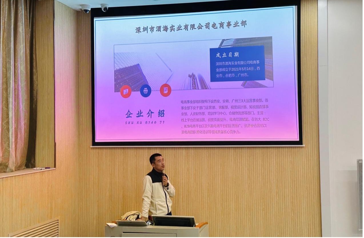 首先宣讲的是深圳市酒海实业有限公司,该公司企业代表杨总介绍了公司的核心业务和文化,以及提供给学生的实习岗位。