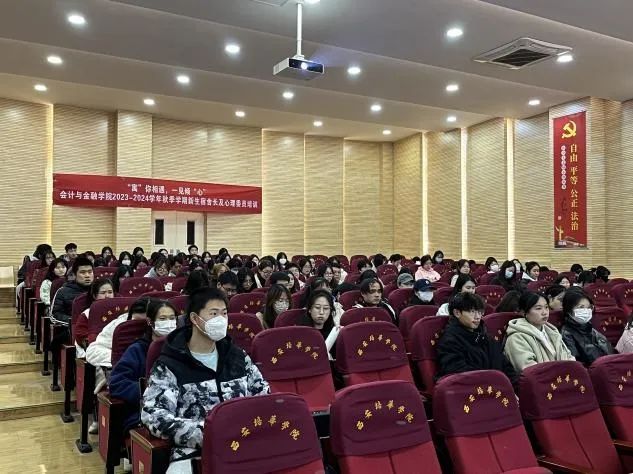 2023年11月13日周一晚,会计与金融学院举办了本学年新生宿舍长及心理委员培训会,学院党委副书记刘斌老师、学生潜能发展辅导站赵娅囡老师、学生社区负责人罗兰老师、新生辅导员谢瑢老师及2023级新生宿舍长和心理委员出席了此次会议。