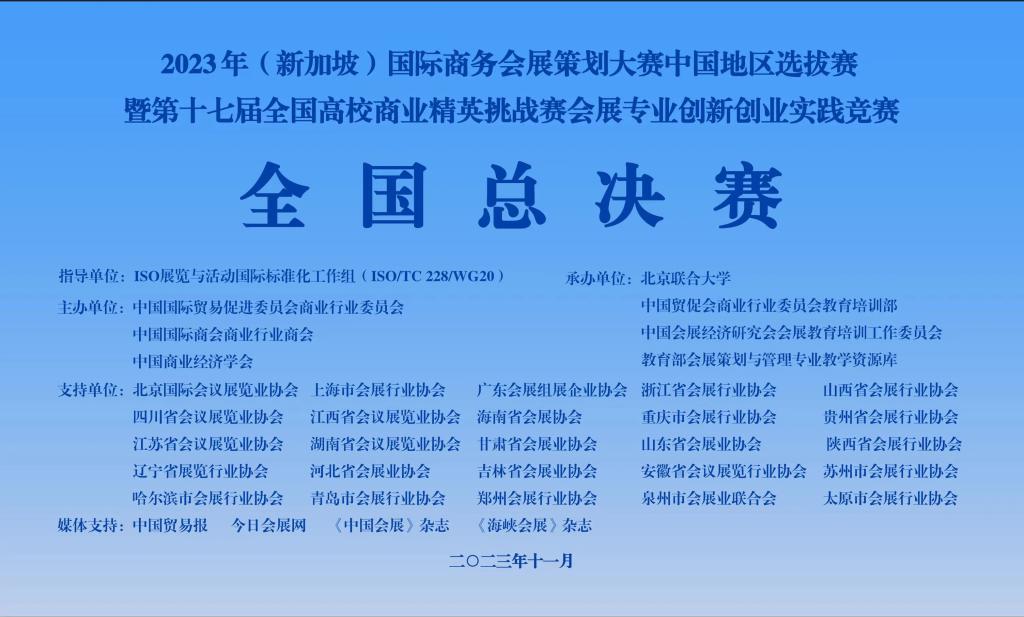 为加快培养新时期应用型、创新型和复合型专门人才,我校学生积极参加第十七届全国高校商业精英挑战赛会展创新创业实践竞赛,经过理论知识赛、校赛、省赛、全国赛等层层选拔,历时8个月时间,于2023年12月2日圆满落下帷幕。