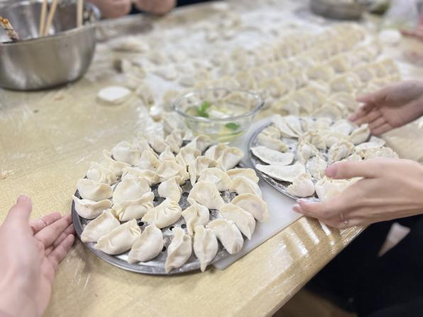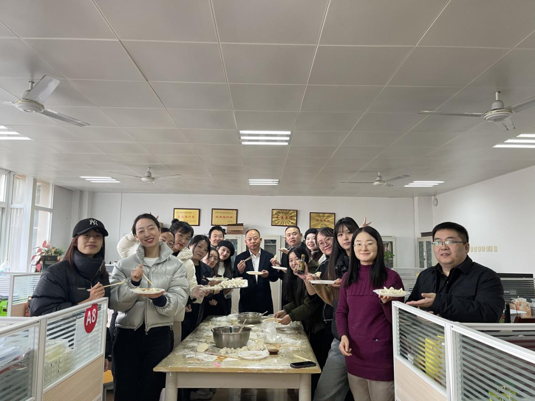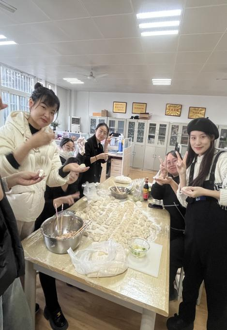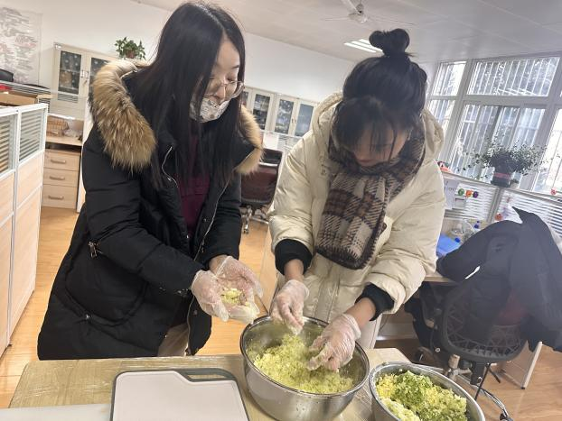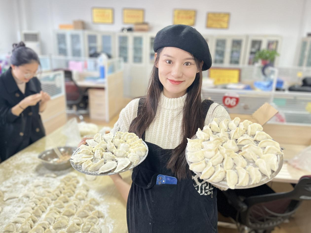 会计与金融学院全体辅导员和学生代表们早早地就准备好了饺子馅、饺子皮、各种调料和丰富的食材,大家围坐在桌前,调馅、擀皮、包馅、烧水、煮饺子每一项都分工明确,井井有条。老师和学生们还互相交流着包饺子的技巧和心得,场面温馨而热闹。