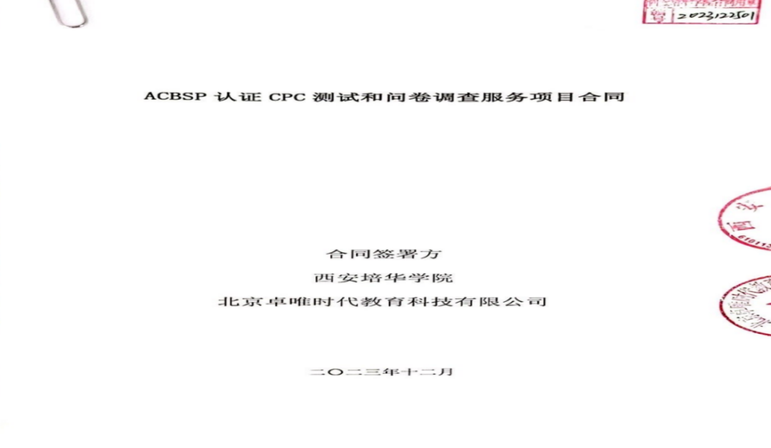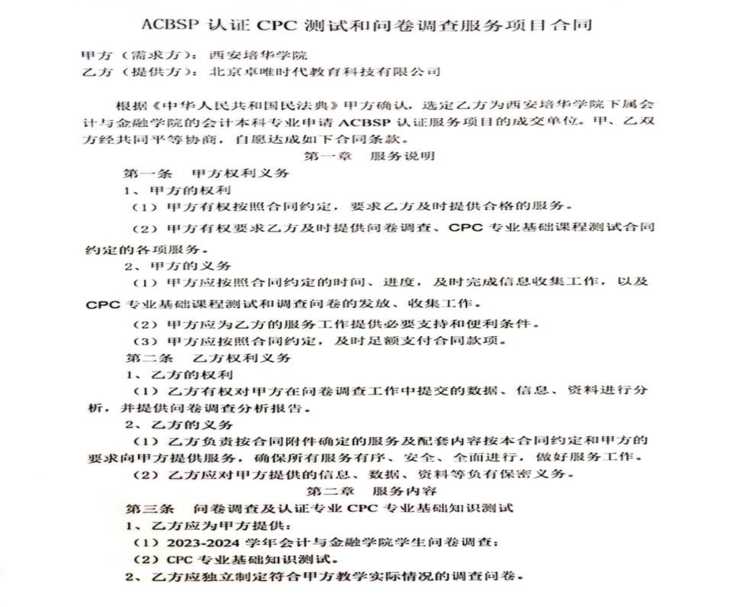 在前期的一系列铺垫工作及对服务商的综合考量的基础上,2023年12月,西安培华学院与北京卓唯时代教育科技有限公司签订了相关认证服务合同,选定由北京卓唯时代教育科技有限公司作为会计与金融学院会计学专业申请ACBSP认证服务项目的成交单位。该合同详细约定了ACBSP专业认证中关于CPC测试及问卷调查的具体内容。