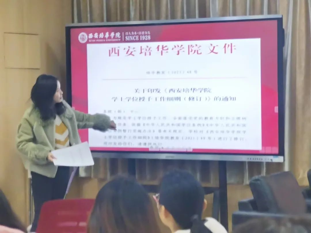 此次集体学习活动是对教师们专业知识的一次重要更新和提升,同时也对学生们今后的学习生活提供了明确的指导和方向。学业导师们将在活动结束后,组织各班级开展以《西安培华学院学籍管理办法》和《西安培华学院学士学位授予工作细则》为主题的班会,确保这些规定不仅被全面理解,而且得到严格执行。
