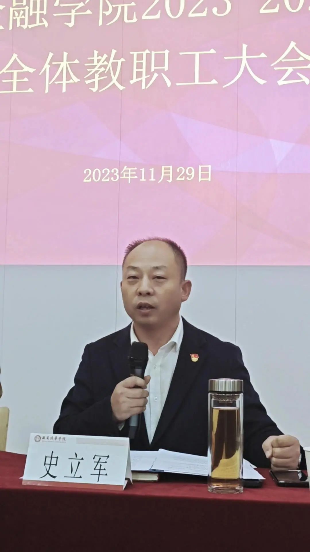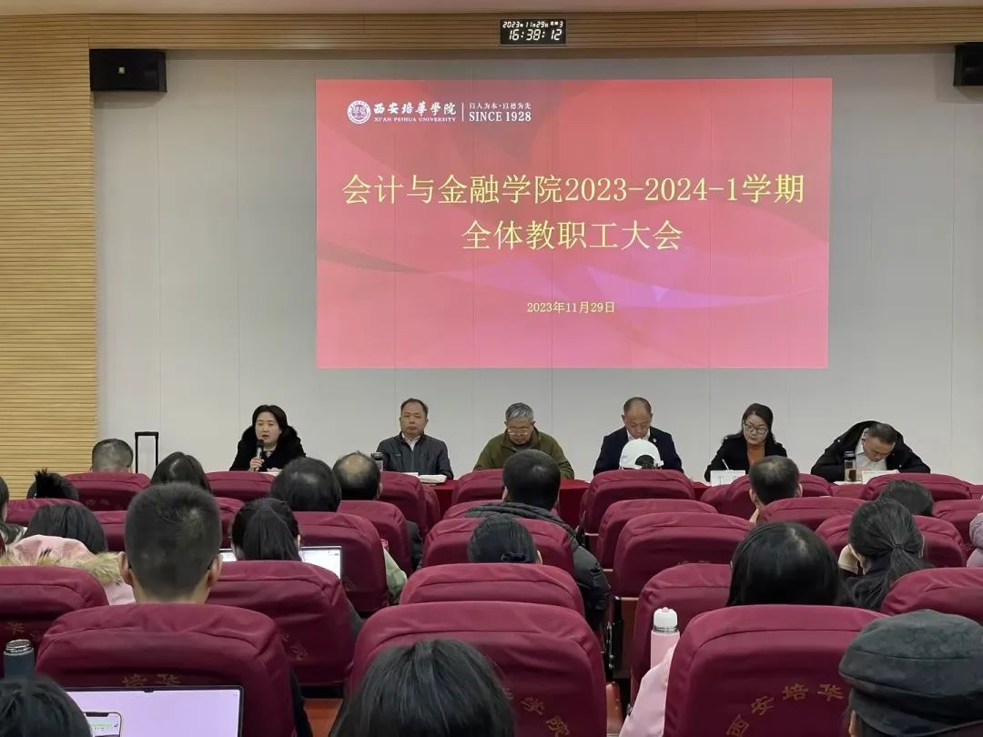为切实保障学院各项工作顺利推进,部署学院近期重点工作,促进学院教育教学高质量发展,会计与金融学院于11月29日在博远楼J201召开了2023-2024学年第一学期第二次全体教职工大会。参与本次大会的人员有会计与金融学院院长赵选民、副院长杨仕鹏、副院长孟君、副院长丁阳、党委副书记刘斌以及会计与金融学院全体教职工,会议由会计与金融学院党委书记兼行政副院长史立军主持。
