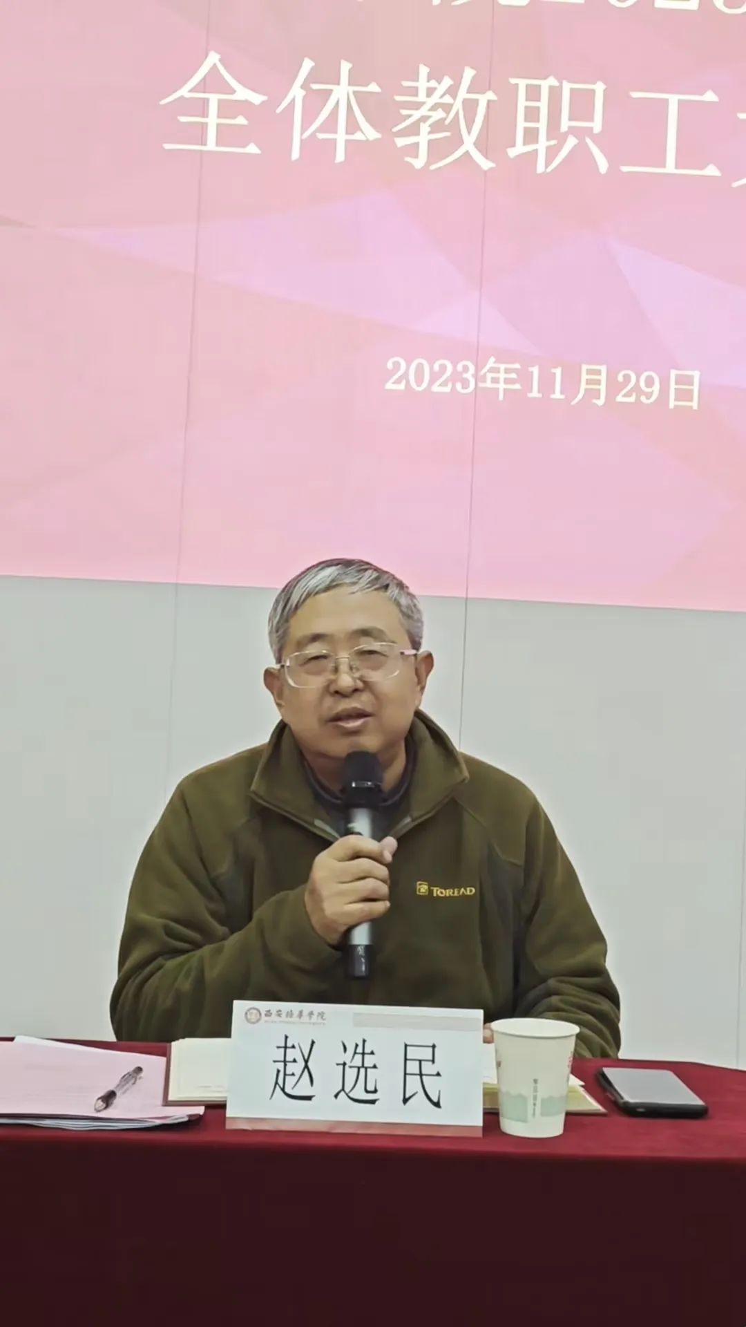 最后,学院院长赵选民作大会总结发言。他提出三点要求,一是全院要强化质量意识,必须把质量贯穿到学院所有的教学、科研、管理服务工作中去。二是全院工作人员要担当,有作为。想把蓝图化为现实,就必须要干实事,要增强主人翁意识,强化集体意识。三是凝聚发展合力。只有所有人齐心协力,心往一处想,劲往一处使,踏踏实实把事情做好,以更高的标准和更严格的要求来推动学院各项事业的发展。