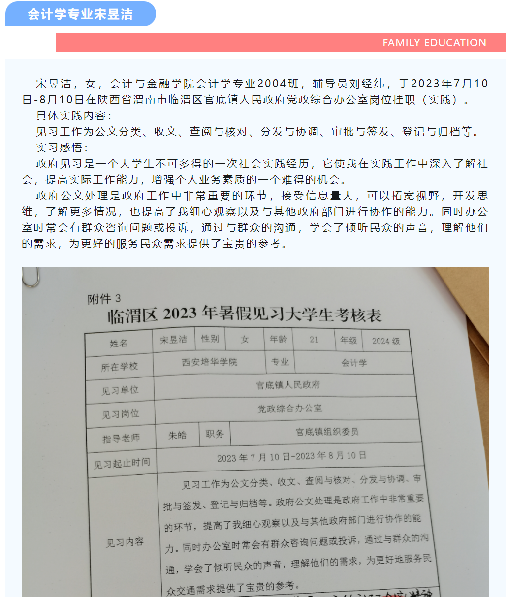 宋昱洁,女,汉族,中共预备党员。该生在校期间保持着积极向上的心态,时时以高标准要求自己,不仅刻苦学习,取得了优异的课程成绩,而且积极参加各种实践活动,努力做到全面发展。在思想上,积极上进,热爱祖国,积极向党组织靠拢,成为中共预备党员。在学习上,在学好专业课程的同时,考取了英语四级证书和普通话证书,获得了正大杯第十三届全国大学生市场调查与分析大赛陕西赛区本科组选拔赛—团体三等奖,连续两年获得西安培华学院三等奖学金并且年级成绩位于年级前15%。在工作上,作为班长和院系青协媒体运营部部长,积极协助老师筹备和开展了开学迎新活动、各类志愿活动,以及班级创建“姜维之班”等。在生活方面,该生严于律己宽以待人,关心集体诚实守信,建立了良好的人际关系。担任宿舍舍长,曾在第五届宿舍公约大赛中荣获优秀奖,在学生服务中心公寓检查第十二周,宿舍检查结果为优。在工作方面,该生为班长和院系青协媒体运营部部长,积极协助老师筹备和开展了开学迎新活动、班级创建“姜维之班”,以及诸多志愿活动。在社会实践方面,在2023年7-8月 参与“返家乡”活动,在陕西省渭南市临渭区官底镇人民政府党政综合办公室见习,增强了沟通与协调能力,坚持德智体美劳全面发展。