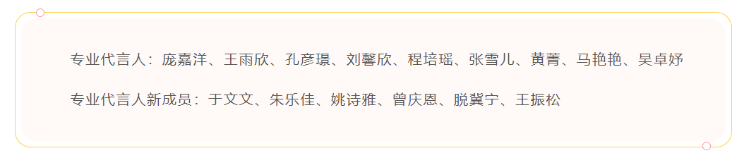 专业代言人是学院宣传工作的重要组成部分,是提高学校生源质量的重要举措,是专业建设的重要内容,是更好进行我院专业宣传工作的基础,也是展示会计与金融学院国家级、省级、校级一流专业的一扇窗。以下是专业代言人名单: