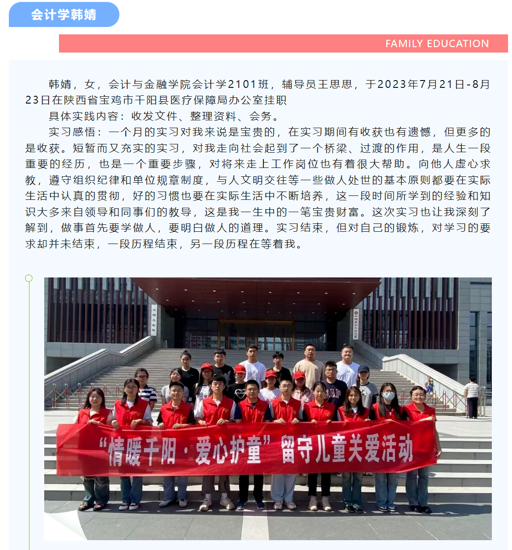 萌芽义教队由会计与金融学院党委副书记刘斌老师、辅导员王婷老师带领6名学生,前往陕西省宝鸡市千阳县西新社区进行10天实践活动,开展了以“关爱留守儿童”为主题的社会实践活动、“太极拳进课堂”“ 防止不法侵害和意外伤害”等主题教育活动。