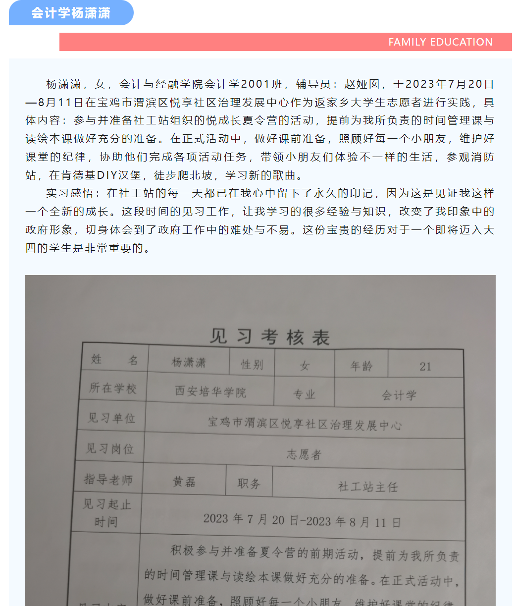 会计与金融学院会计学2102班学生,先后荣获:西安培华学院党委学生工作部“优秀学员”;西安培华学院会计与金融学院学生干部素质培训“优秀学员”;47期积极分子党课培训优秀学员等。其作为一名宣传委员,能够积极参与组织团日活动,配合团支书完成日常工作。带动身边的同学共同学习、共同进步,主动帮助有困难的同学,多次参与院系组织活动,不断丰富自身,提升自身能力,做到遵守校纪校规,严格要求自身,按时到课。