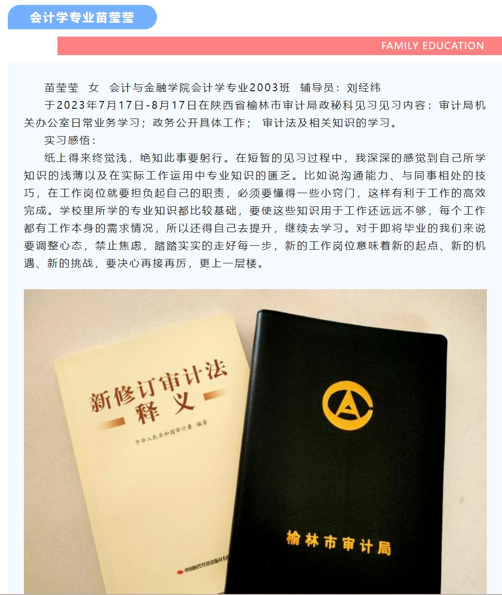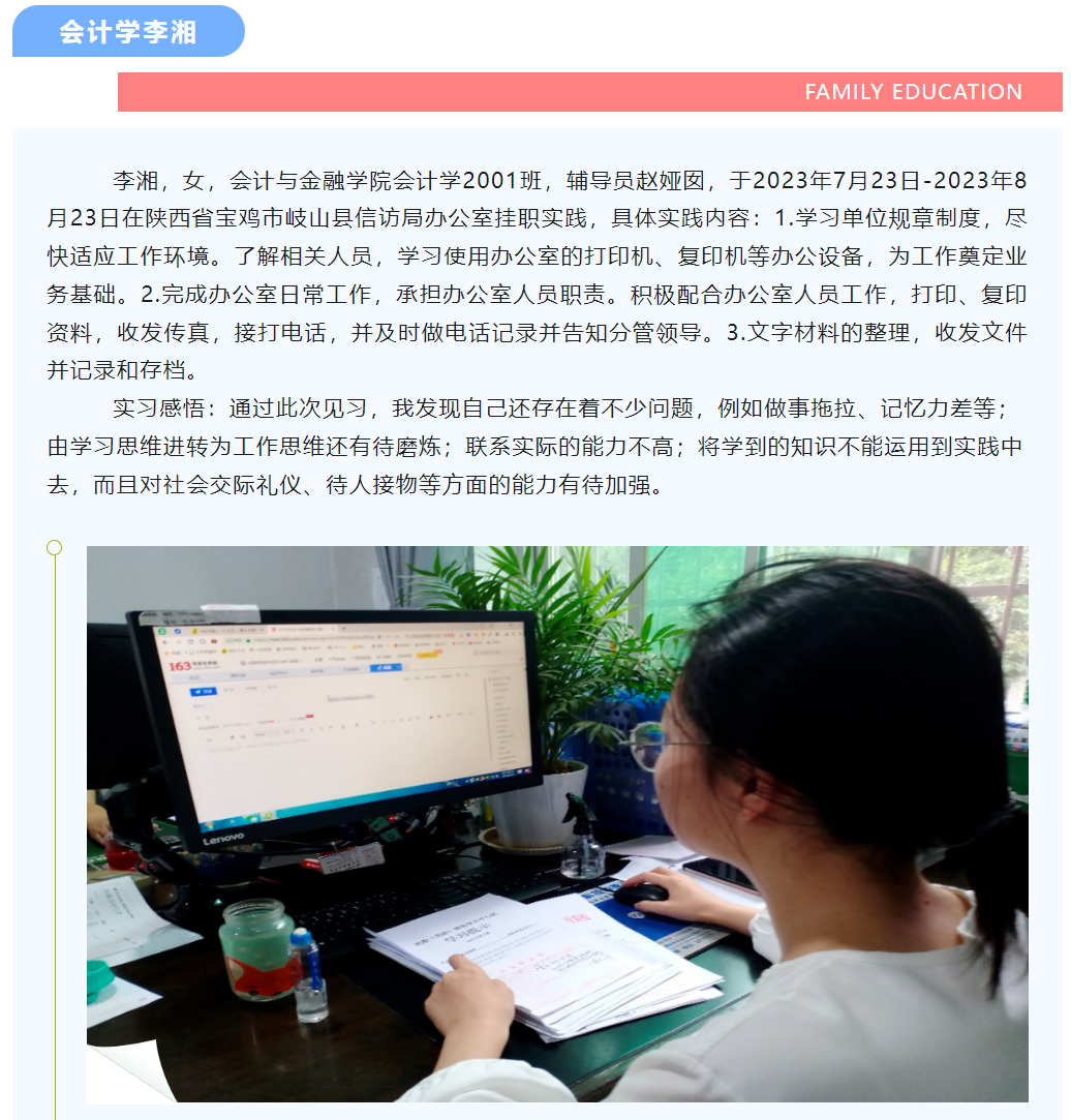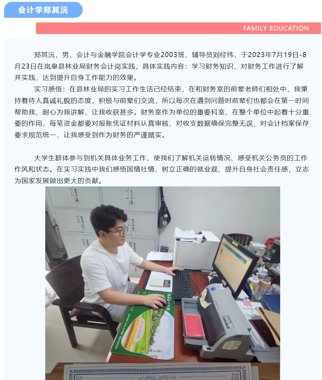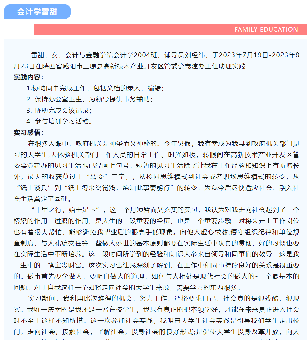 会计与金融学院会计学(卓越)2201班学生,在2023年“雷锋月系列”活动中荣获先进工作者,现担任会计与金融学院青年志愿协会校友服务部副部长和新媒体工作室微创中心部长。在这半年内,能做到顾全大局,摆正公事与私事的位置,始终做到以工作为重;立足本职岗位,圆满完成本职工作和各级赋予的各项任务;通过在工作中努力学习实践、梳理总结,工作能力也得到了提高。在今后的工作中,我将在思想上与党保持一致,工作能力上认真总结经验,吸取教训,努力提升,尽职尽责地做好各项工作,不辜负信任与期望。