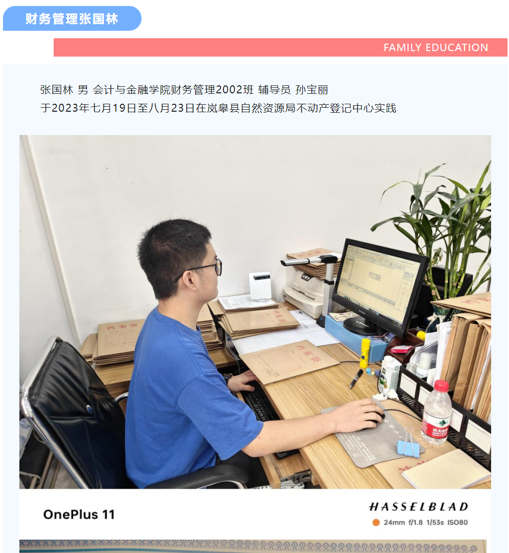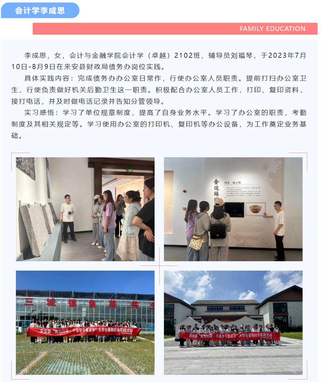 会计与金融学院财务管理2202班学生,积极参加各种活动,不断丰富政治理论知识,始终保持坚定正确的政治方向,2022年被评为“优秀共青团员”,2023年成为“双代会”学生代表,在思想方面不断向党组织靠拢,不断加强自身素质的同时,做好各项工作,全心全意为同学服务。今后必将严格要求自己,发挥模范带头作用,时时刻刻以党员的标准严格要求自己。