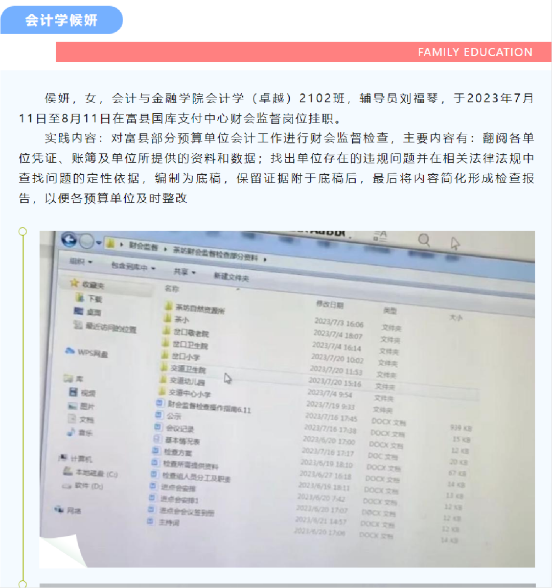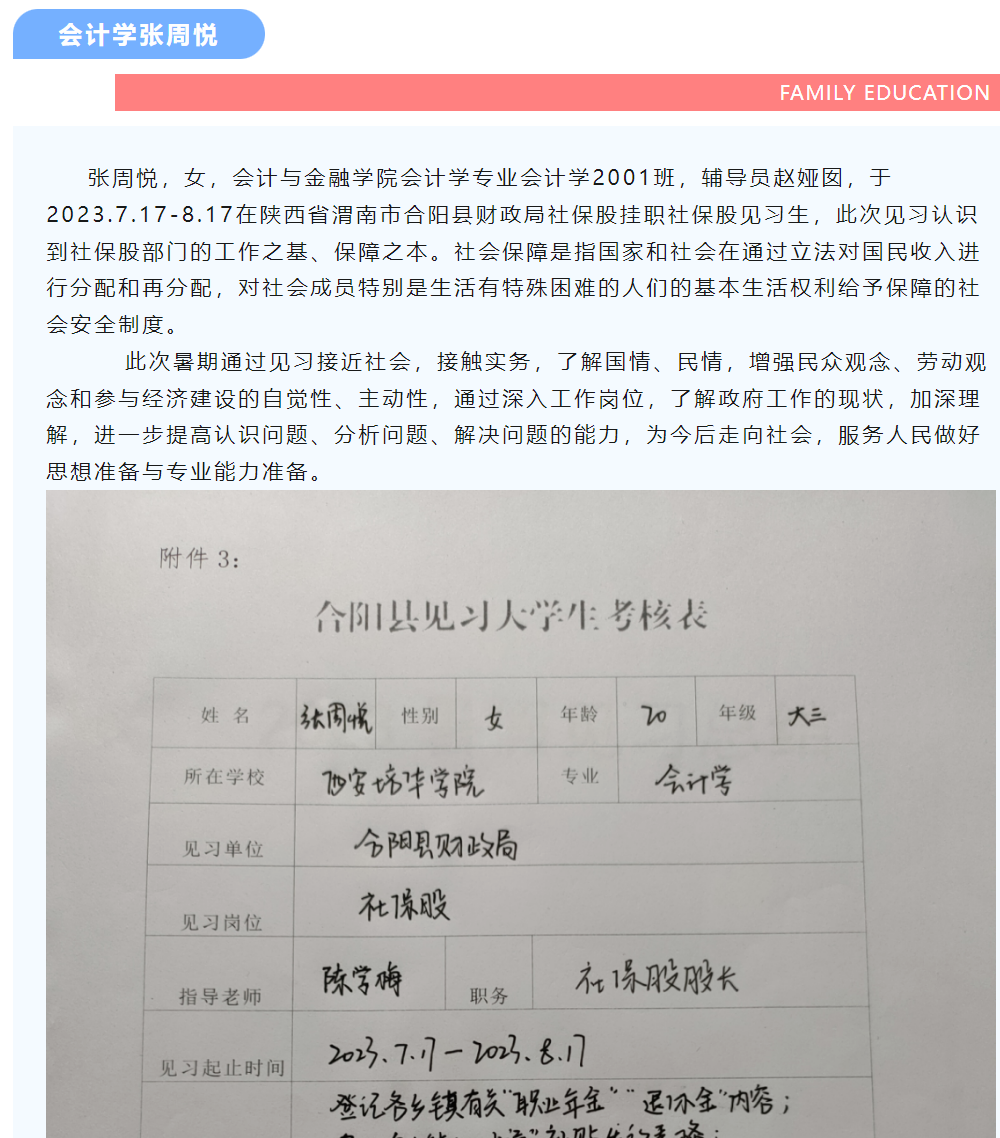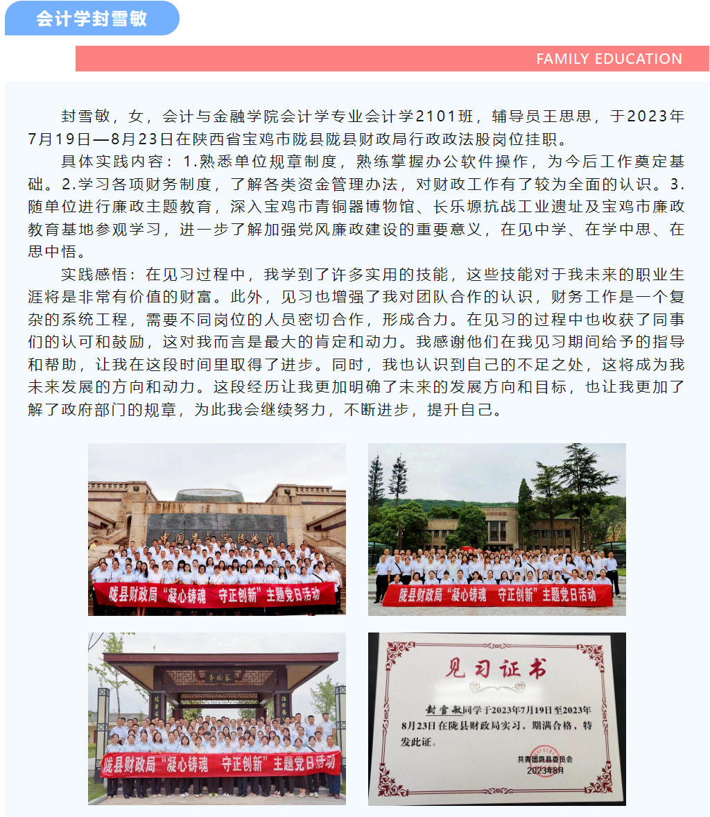 会计与金融学院财务管理2202班学生2023年5月成为2022级校会志愿者、 2023年3月在“迎审核评估,学雷锋精神,传培华校史”知识竞赛中荣获“特等奖”2023年4月获得商务办公专家 (高级)证书。自从进了院党委工作,能够立足本职岗位,服务同学,锻炼自己。在思想上,不断向党组织靠拢,树立正确的价值观和人生观,以高标准严格要求自己。积极参加学校各种活动,积极工作,不断丰富自己,提升自身能力。在工作半年的时间内,提升自己的组织能力和协调沟通能力。在今后我会以党员的标准要求自己。在生活方面,性格开朗,乐于助人,积极带动身边的同学共同学习、共同进步,主动帮助有困难的同学。对工作热情,责任心强,具有良好的组织交际能力,并时刻以优秀共产党员模范标兵为指引。积极配合党委负责老师有序开展党支部工作,做好协调与配合。
