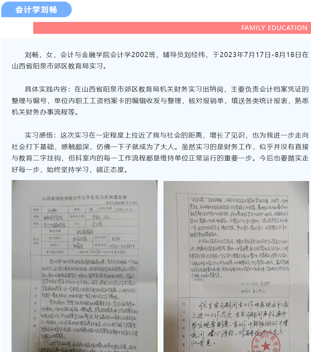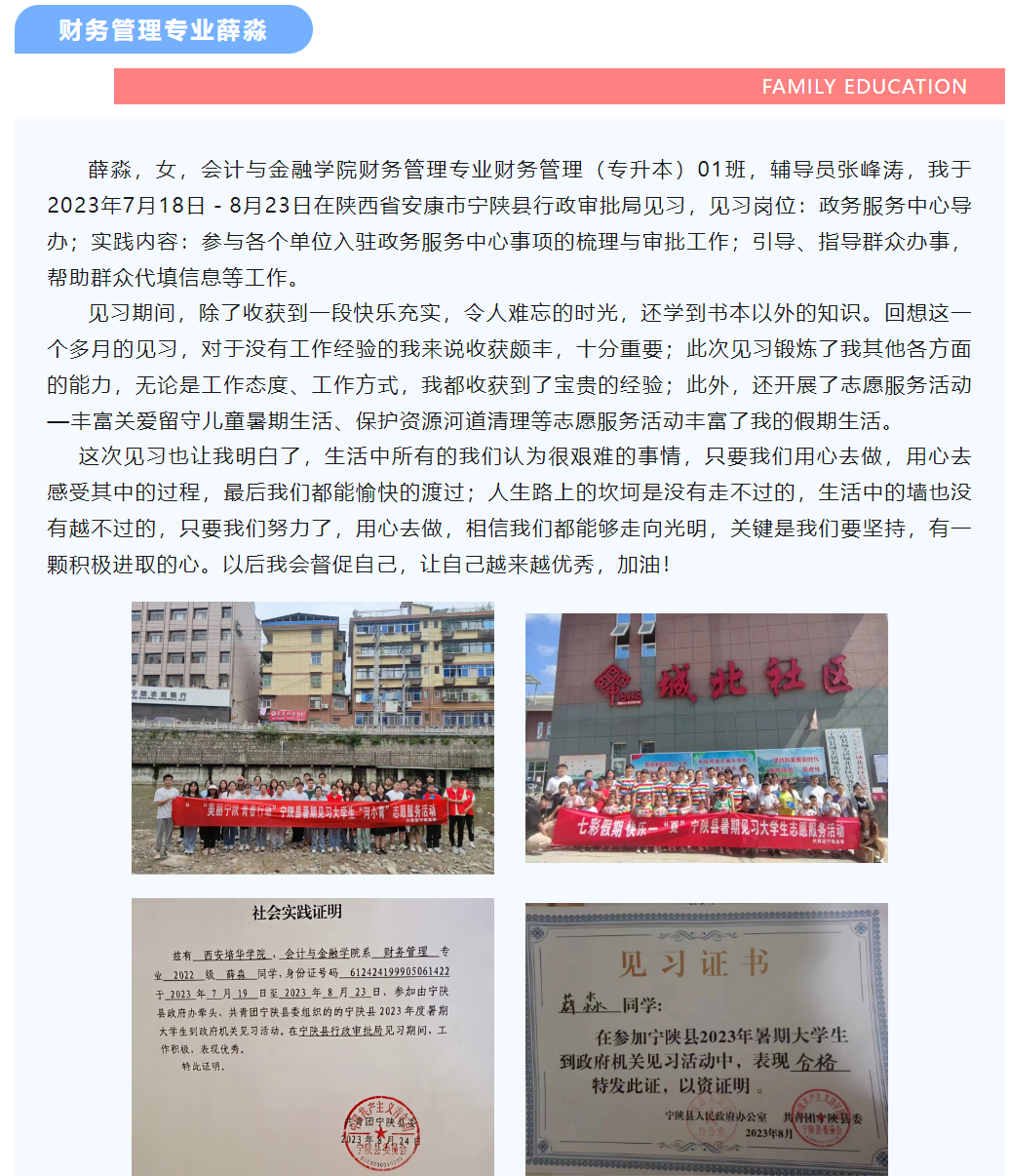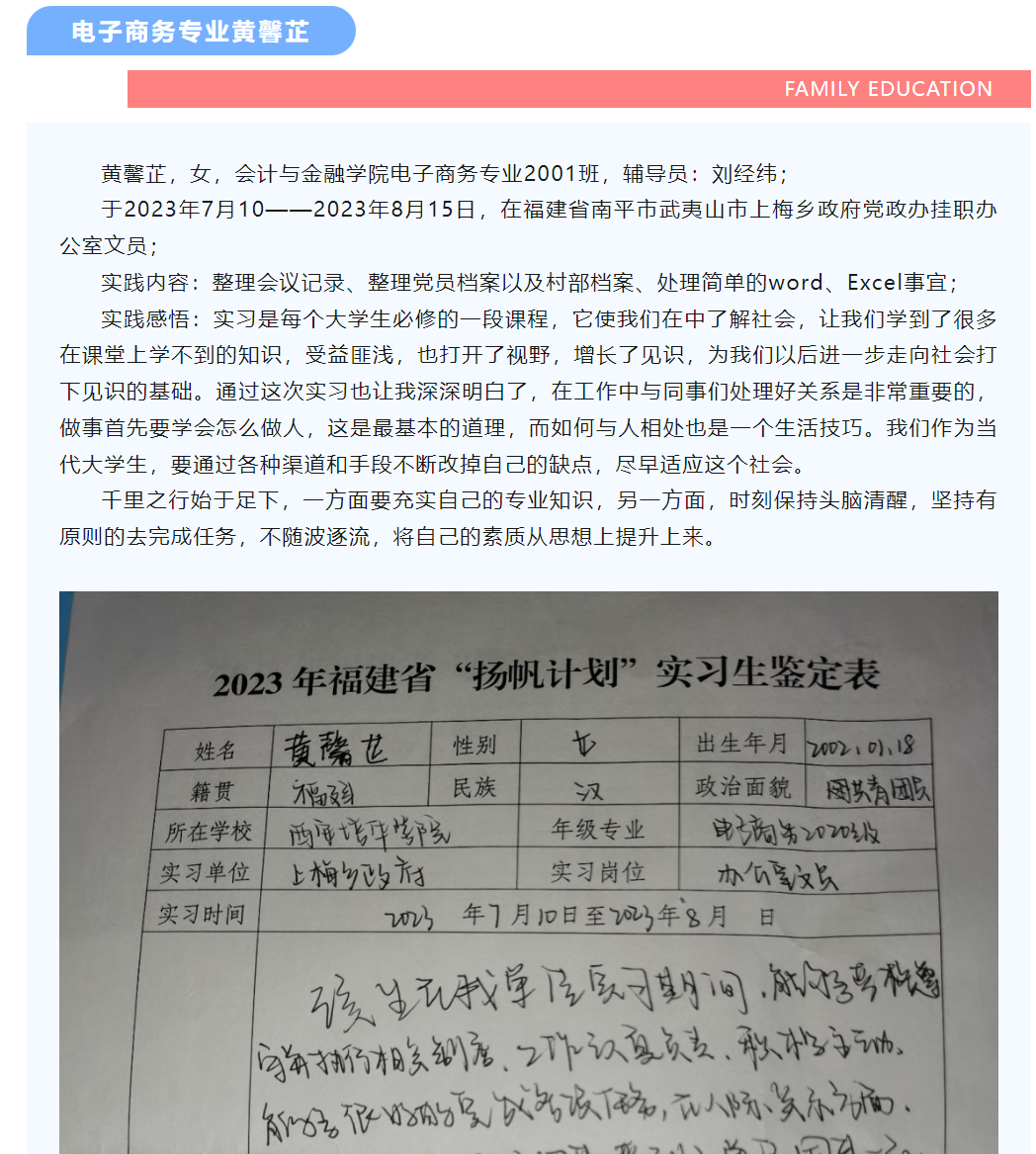 来自会计与金融学院会计学2201班。自入校以来,积极参与班级以及院级志愿服务活动,并且参加企业运营仿真大赛获得优秀奖,考取了普通话二甲证书,有强烈的集体责任感和上进心,具有良好的思想素质。始终严格要求自己,积极努力去提高自我能力,以个人的全面发展作为努力的方向,树立正确的世界观、人生观和价值观。在班级里为人善良,乐于助人;在组织里做事踏实、责任心强,与各成员团结协作及时完成任务,服务同学,努力把自己塑造成一个有专业功底和适应能力,有团队协作和团结友爱精神的青年,为实现个人价值打下坚实的基础,使自己与他人都能更好地前进。