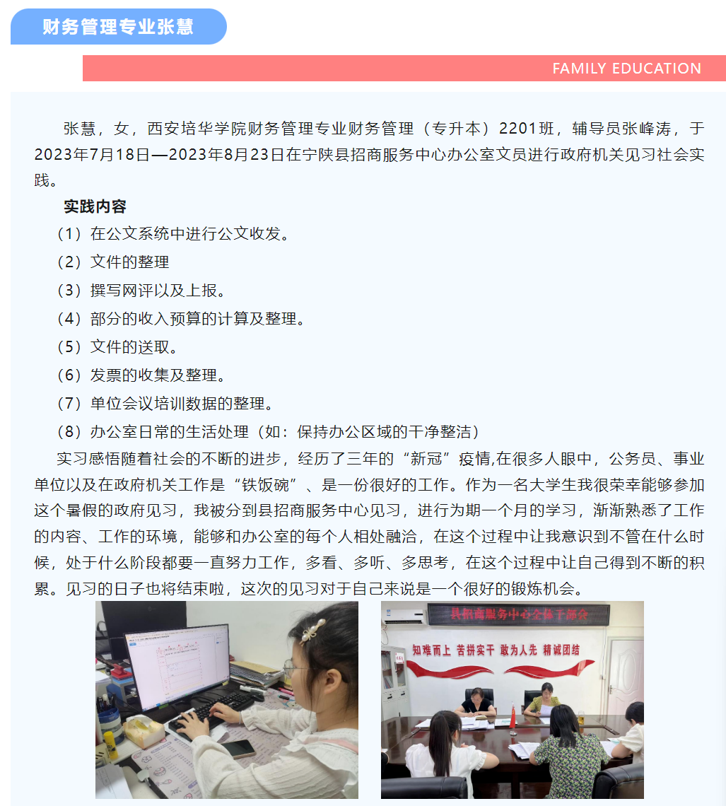 工作期间,多次组织学院以及学校的各项活动。参与过大学生创业项目并获省级立项,同时被授予优秀共青团干部,在疫情防控期间表现突出被评为先进个人、获得辅修金融工程专业毕业证书、西安培华学院学业进步奖,被中共西安培华学院会计与金融学院委员会评为“优秀党支部助理”;实践方面,参加2021年暑期三下乡社会实践活动,实践活动中“心夏乡”助力乡村振兴服务队帮助当地解决滞销问题,得到当地政府、企业以及农户的肯定,体现了大学生的青年担当。
