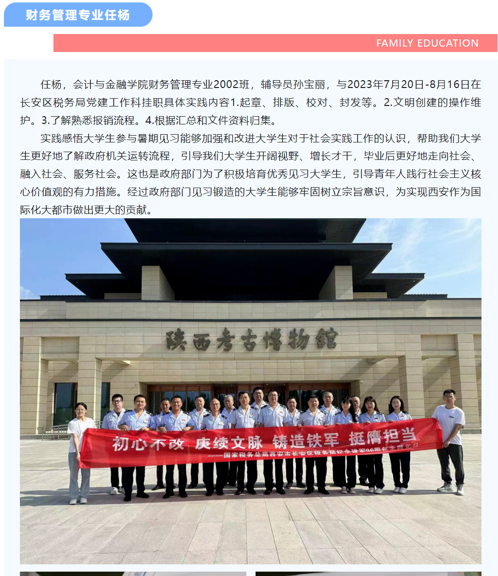 “情系宜君,匠心筑遗”—传承之光实践队由会计与金融学院副院长丁阳院长、团委书记寇方译老师带领8名学生荣获“财经报国青年力行”财经专项团中央立项,实践队伍前往陕西省铜川市宜君县文化馆进行11天实践活动,开展了以“非遗”“反诈宣传”为主题的活动。通过实地调研、走访手艺人之家,了解宜君剪纸对当地人经济文化生活的影响。