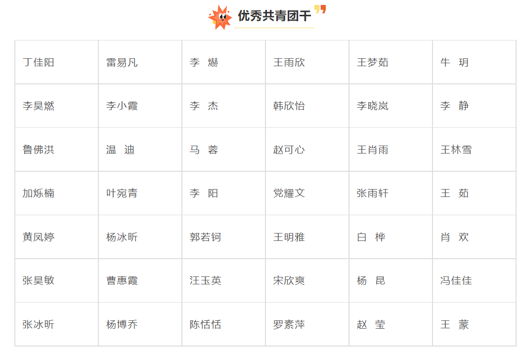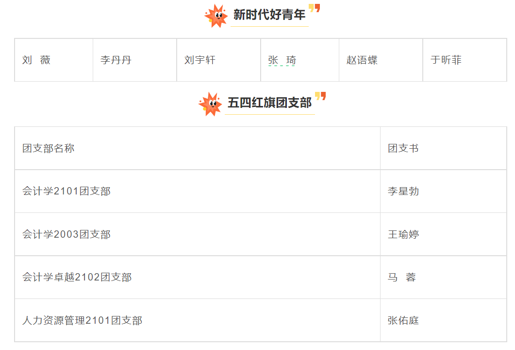 根据学校《关于评选 2022-2023 学年优秀共青团员 优秀共青团干部 新时代好青年 五四红旗团支部》的文件精神,经学院各团支部推荐和各组织申报,院团委审核,现推荐以下团干及团员为2022—2023学年会计与金融学院“新时代好青年、优秀共青团干部、优秀共青团员、五四红旗团支部”。