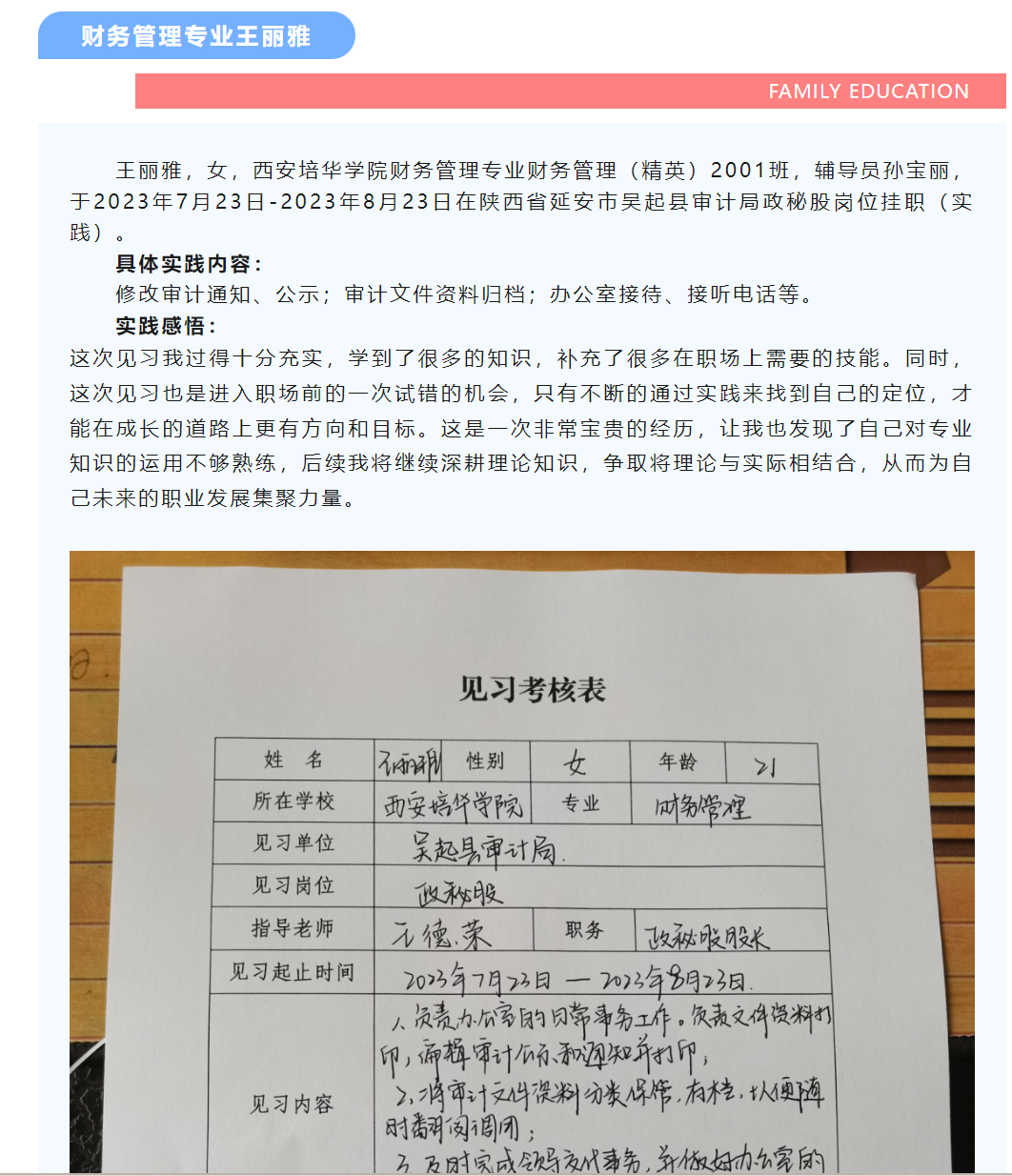 冉红莉,女,汉族,中共预备党员,现担任会计学(专升本)2301班学习委员。先后获得2021年4月获第五届全国大学生环保知识竞赛“优秀奖”,2021年4月获“培华学子爱国奋斗故事”征文优秀奖,2021年6月获“第七次人口普查二等奖”,2021年12 月获普通话水平考试证书,2022年七月通过了初级会计资格考试,2021—2022学年获培华学院三等奖学金。2021.7.4-2021.8.25参与实习,实习岗位为浙江岘峰有限公司杯成品部巡检,主要工作是对流水线的产品各工序进行首检、巡检工作;负责检查各工序质量控制,落实车间各项标准制度监督引导车间员工形成自检、互检的工作习惯。校园活动:加入学院青年志愿者协会跟随组织参加志愿活动:秋风扫落叶、公益捡跑、流浪狗基地活动。全国第七次人口普查辅助普查工作人口录入等。