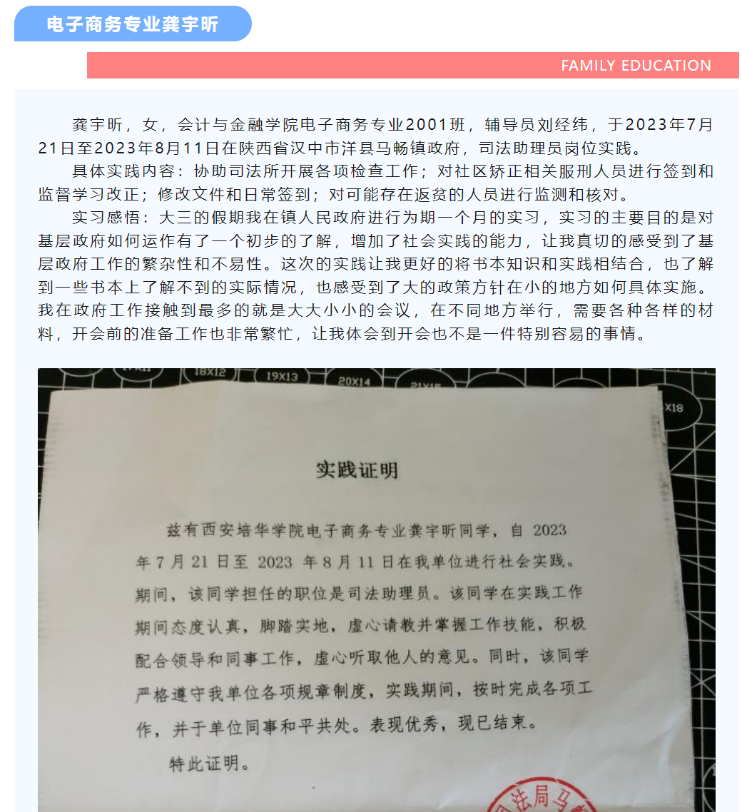 来自西安培华学院会计金融学院电子商务2201班,在思想上,乐观向上,富有创造力,积极向党组织靠拢,工作上,身为学生组织干部,富有责任心;生活上,勤俭节约,乐于助人,获得计算机二级、普通话、OA证书,争鸣杯辩论赛第一名、第九届互联网+校级优秀奖等,钝手外,敏于心,精于恩,谨于行,全心全意为人民服务。