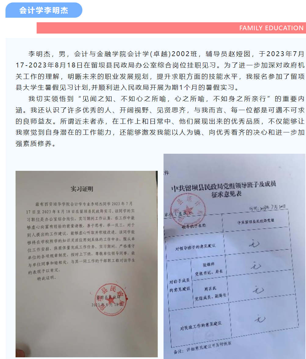 大一一年以来,该生在学习上努力进取,对班级工作认真负责,积极参加各类比赛,目前所获得的荣誉及证书有:2022年获中共西安培华学院委员会党校结业证书,2023年荣获计算机二级证书,2023年荣获商务办公证书,2023年荣获“迎审核评估,学雷锋精神,传培华校史”知识竞赛二等奖,2023年荣获学雷锋志愿服务活动先进个人,2023年荣获会计与金融学院学习二十大知识竞赛优秀奖,2023年荣获第五届“水墨丹青迎校庆,陶子执笔寄深情”优秀创作者称号,2023年“井上添花,绘美校园”井盖大赛优秀奖,2023年荣获第七届大学生环保知识竞赛优秀奖,2023年荣获全国大学生电子商务“创新,创意及创业”挑战赛获得校级赛二等奖、最佳创业奖、最佳创意奖。
