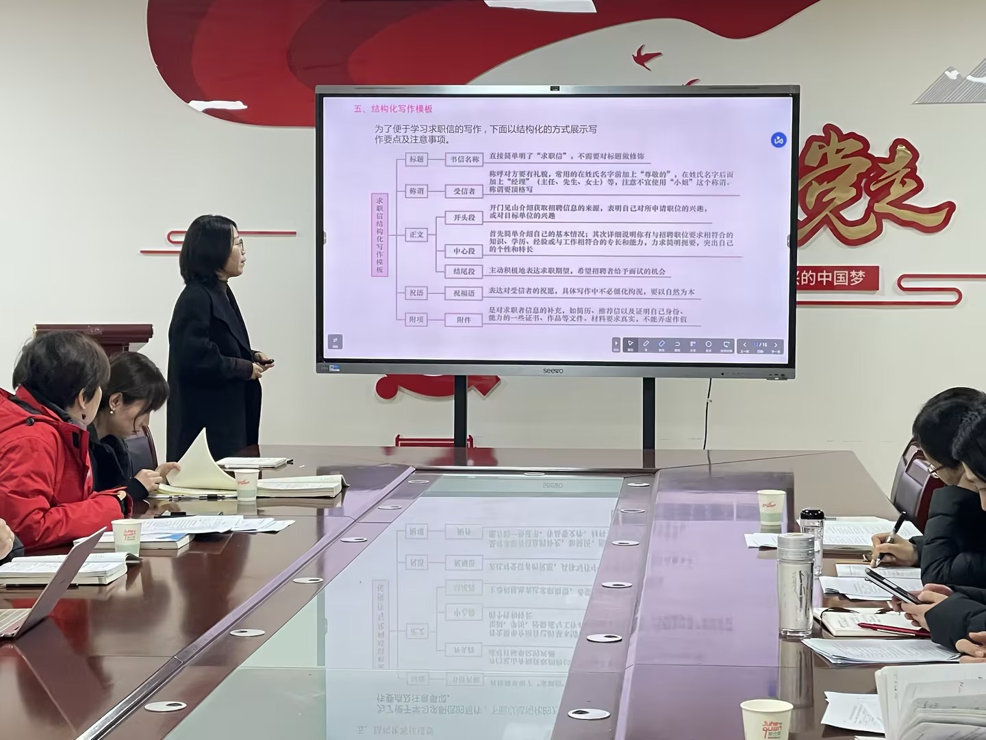 贺佳老师讲授《经济应用文写作》课程中求职信,贺老师首先强调了求职信在求职过程中的重要性,接着,她详细解析了求职信的写作技巧。试讲结束后,评委提出了一些宝贵的建议,如增加更多互动环节,让学生更深入地理解求职信的实际应用。
