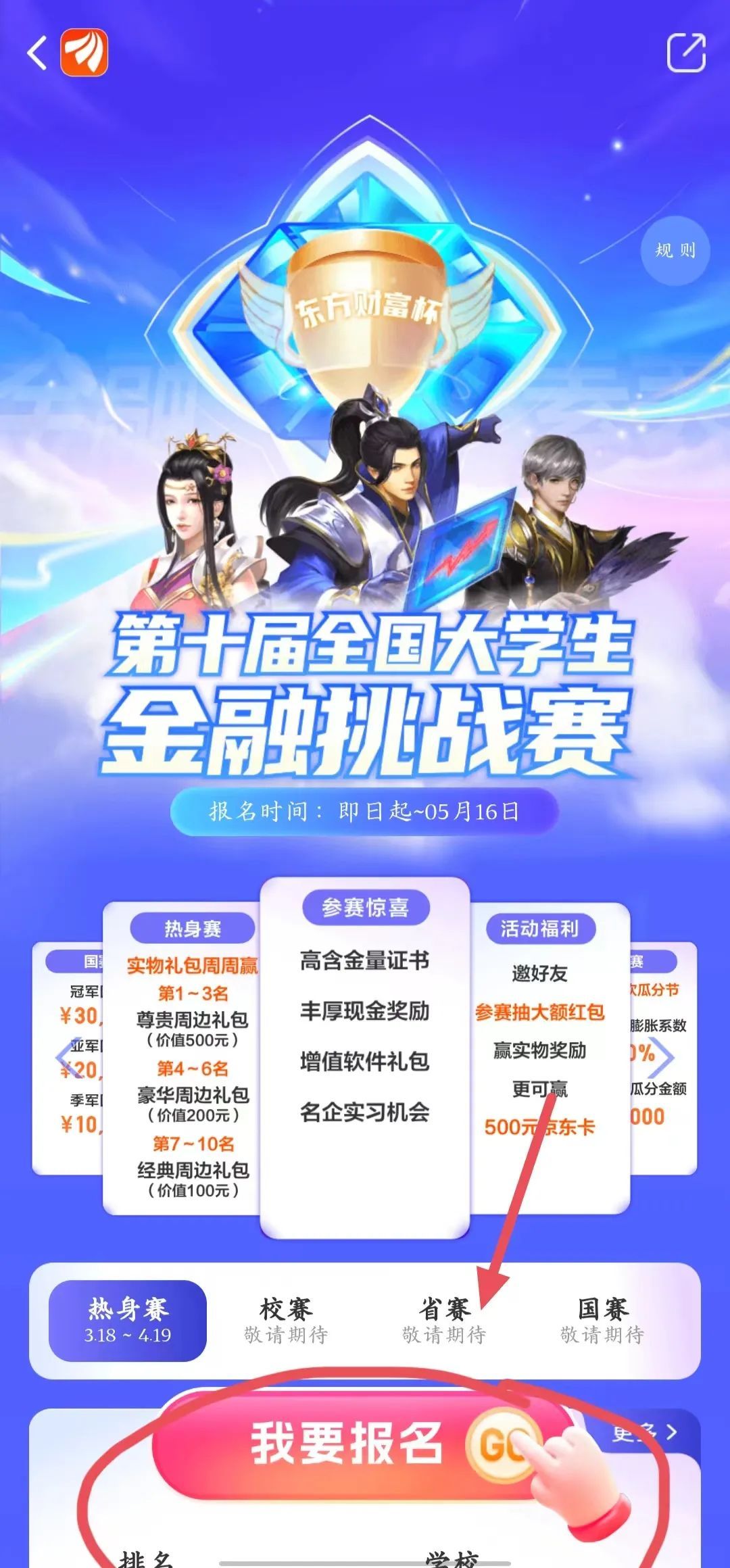 第十届“东方财富杯”全国大学生金融挑战赛分为校赛、省赛和国赛三个阶段。参赛学生及团队使用大赛专用平台东方财富APP,以沪深上市的A股品种进行比拼。
