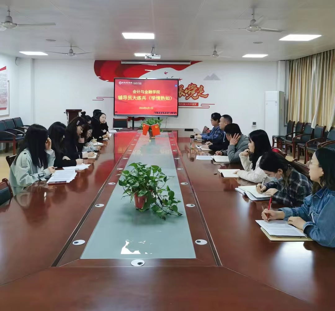 为进一步加强辅导员队伍建设,提升辅导员业务能力,积极推动我院辅导员练就过硬本领,夯实业务基础,提升业务能力,会计与金融学院全体辅导员于4月1日下午16点在博远楼2115举办辅导员大练兵活动。