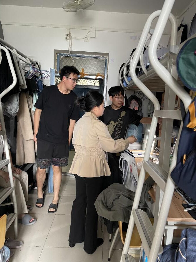 随后学院全体辅导员老师逐间走访了学生宿舍。在此次走访中,重点检查了宿舍是否存在违规电器、乱接乱拉电线、易燃易爆物品等安全隐患,宿舍阳台、卫生间、宿舍过道等是否堆积杂物,以及宿舍内务整理情况。经检查,至诚学生社区宿舍整体情况较好,无重大安全隐患。个别宿舍存在吸烟、存放违规电器等行为,已责令违规宿舍立即整改。针对部分宿舍存在的宿舍室内、阳台物品摆放较多、门口垃圾清理不及时等问题,辅导员老师逐一进行了提醒,要求尽快将宿舍归纳整理、保持良好环境。