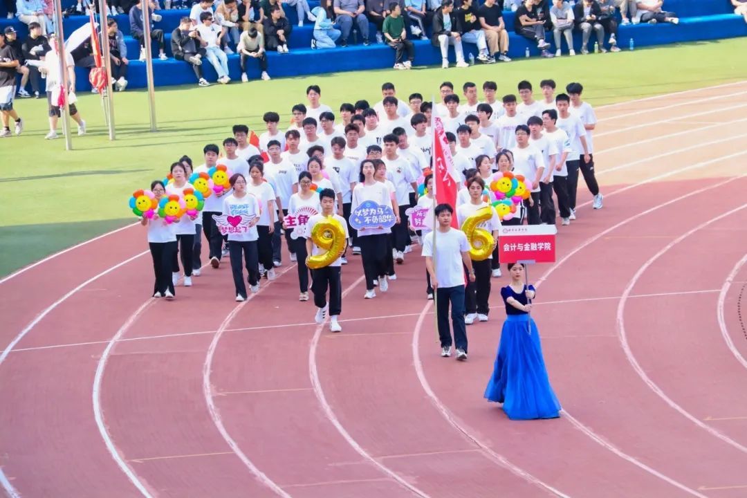 赛场上,五彩斑斓的旗帜随风猎猎作响,观众席上人群熙攘,万众瞩目。开幕式首项议程,由各学院队伍组成的方阵依序步入会场,进行特色鲜明的入场展示。会计与金融学院的学子们身姿矫健,步履坚定,他们神采奕奕,队形严整,尽显青年学子的蓬勃朝气与昂扬斗志。