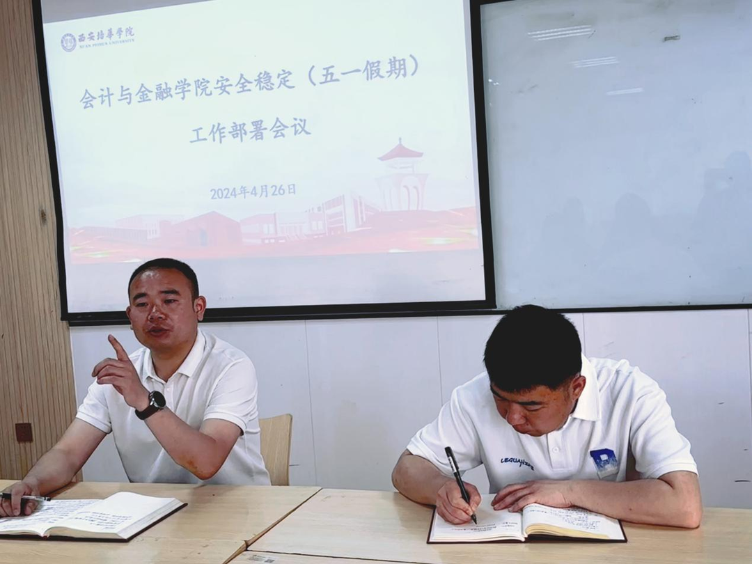 为进一步落实五一安全稳定工作,切实做好五一假期期间学生安全教育管理工作,根据西安培华学院关于2024年五一劳动节放假安排的通知,结合学校关于安全稳定工作部署会议的内容要求,会计与金融学院根据工作实际,特于2024年4月26日在博远楼2217召开了“会计与金融学院安全稳定(五一假期)工作部署会议”。