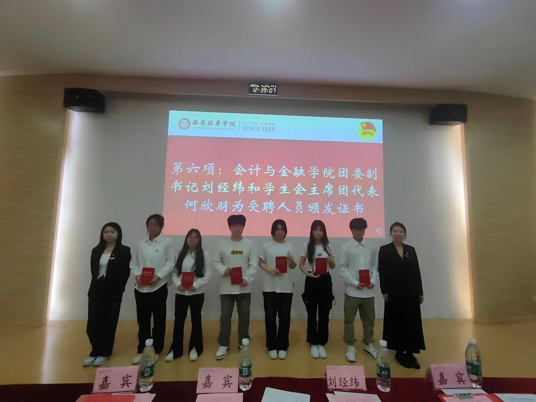 会计与金融学院团委副书记刘经纬和学生会主席团代表何欣羽为权益提案工作委员会成员颁发聘书。
