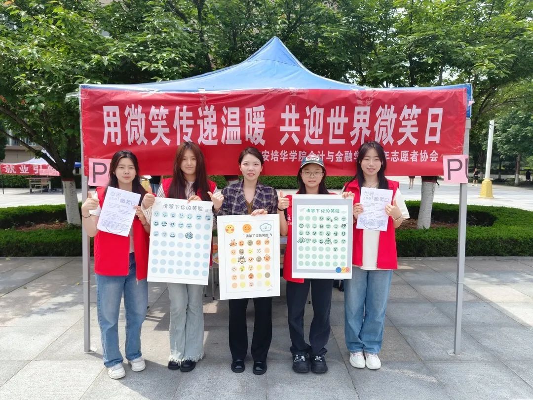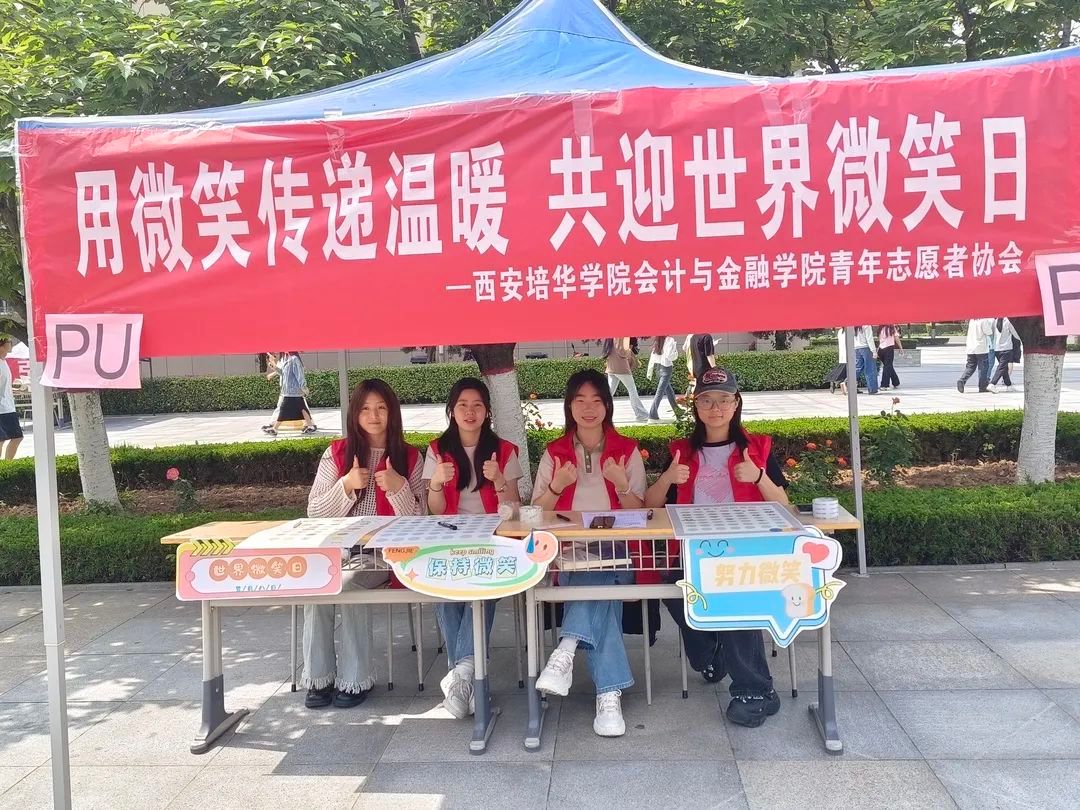 2024年5月8日西安培华学院会计与金融学院青年志愿者协会在博远楼门口成功举办一场以“用微笑传度温暖,共迎世界微笑日”为主题的活动。活动现场中,同学们脸上洋溢着灿烂的笑容,用微笑传递着温暖与善意。