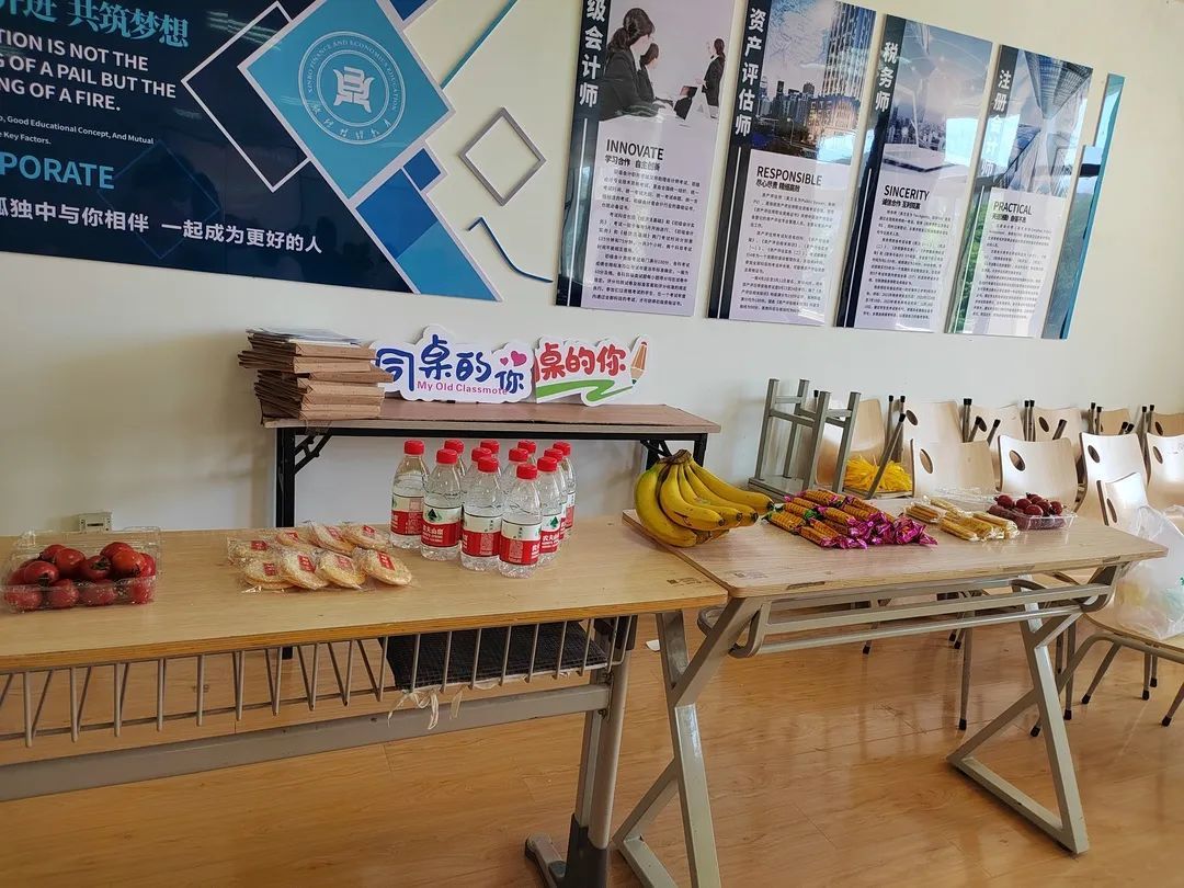 答辩环节是许多同学最后一次进入课堂,甚至最后一次在母校停留。会计与金融学院在每个答辩教室设置学生饮水水果区,温馨整洁的教室,暖心的举措 ,温暖每一位即将毕业的学子。
