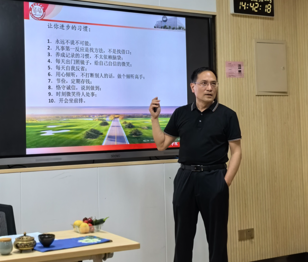 韩老师同时给出了缓解压力的具体建议。建议一,在工作中修行。真正的修行是红尘炼心。生活的历练使我们的人生更加丰盈,不要怕遇到障碍,它可以历练你的心性,提高你的层次,增长你的智慧。修炼美德,学会体贴、尊重、宽容、诚实、负责、平和、礼貌、富有爱心。建议二,于独处中修行。从艰苦中走出来的人,才懂得人情练达,静处修心提悟性,独行方知天地宽。建议三,气度决定高度。压力对于天才是块垫脚石,对能干的人是一笔财富,而对于弱者则是万丈深渊。用简单的心态看世界万物,则一目了然。建议四,以高者为伍,与德者同行。习总书记说:“以金相交,金耗则忘;以利相交,利尽则散;以势相交,势败则倾;以权相交,权失则弃;以情相交,情断则伤;唯以心相交,方能成其久远。合伙做事也好,人际交往也好,都应珍惜缘分,珍惜时光;以善为念,学会感恩;以诚相待,以心相交!与高者为伍,与德者同行,必得善果!”