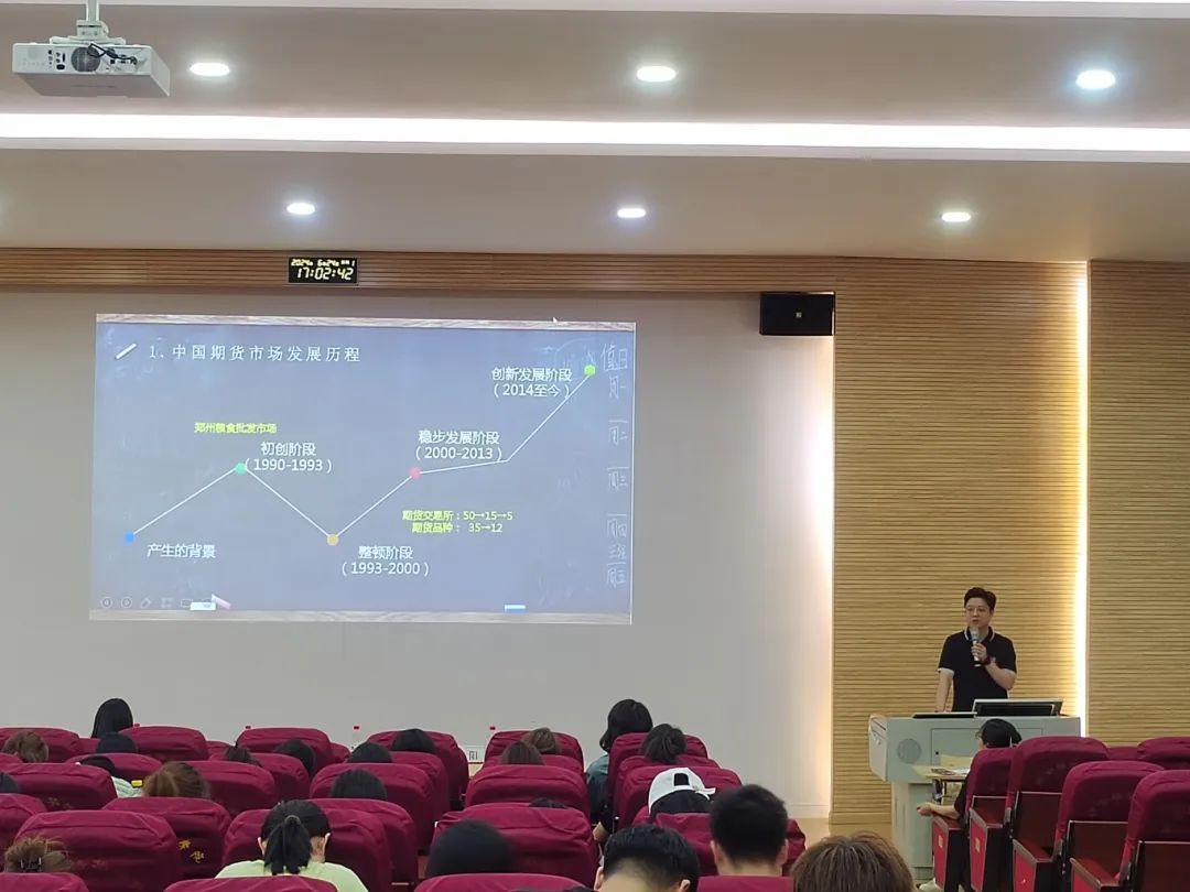 迈科期货齐浩男为在场的学生们带来了一场关于期货基本知识的讲座。他从我国期货市场的发展现状讲起,详细介绍了期货合约的种类、交易的基本规则以及相关的法律法规。齐浩男的讲解不仅增进了学生对期货市场的理解,也为他们未来的金融职业生涯打下了坚实的基础。