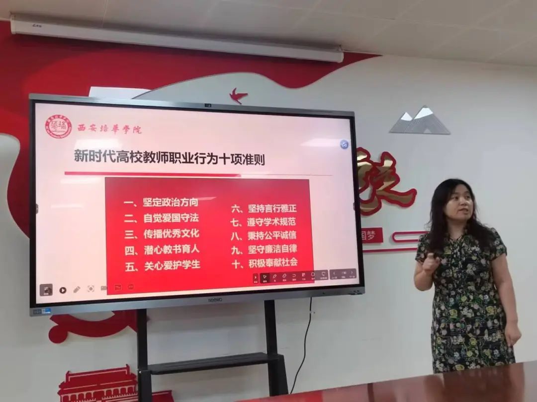 原亚丽主任带领全系教师学习了新时代高校教师职业行为的十项准则,包括坚定政治方向、自觉爱国守法、传播优秀文化、潜心教书育人、关心爱护学生、坚持言行雅正、遵守学术规范、秉持公平诚信、坚守廉洁自律、积极奉献社会。原亚丽主任不仅传达了教师职业行为的高标准要求,也激发了教师们对于自身角色和责任的深刻思考,强调教师应严格遵守这些准则,从自身做起,注重师德师风的建设。