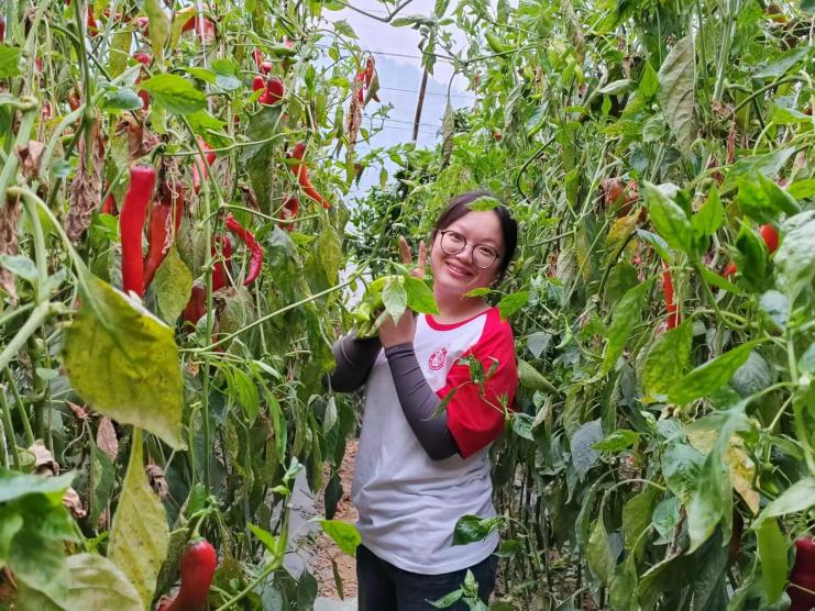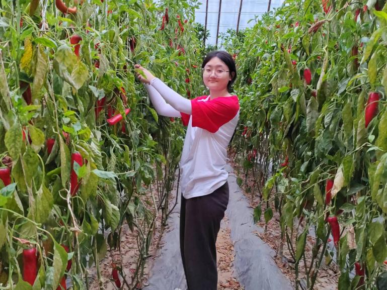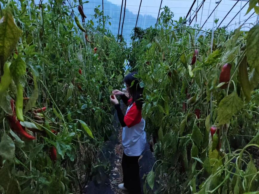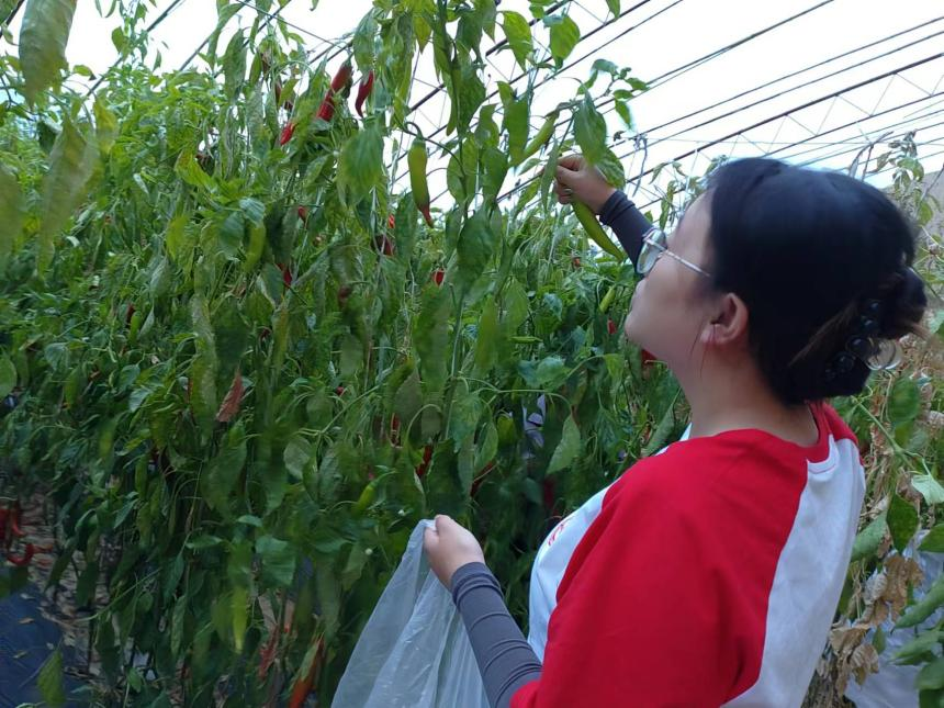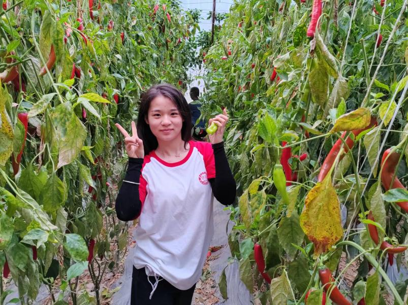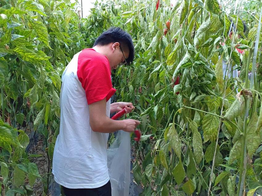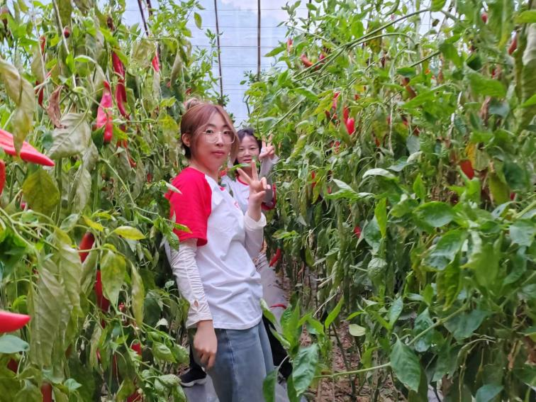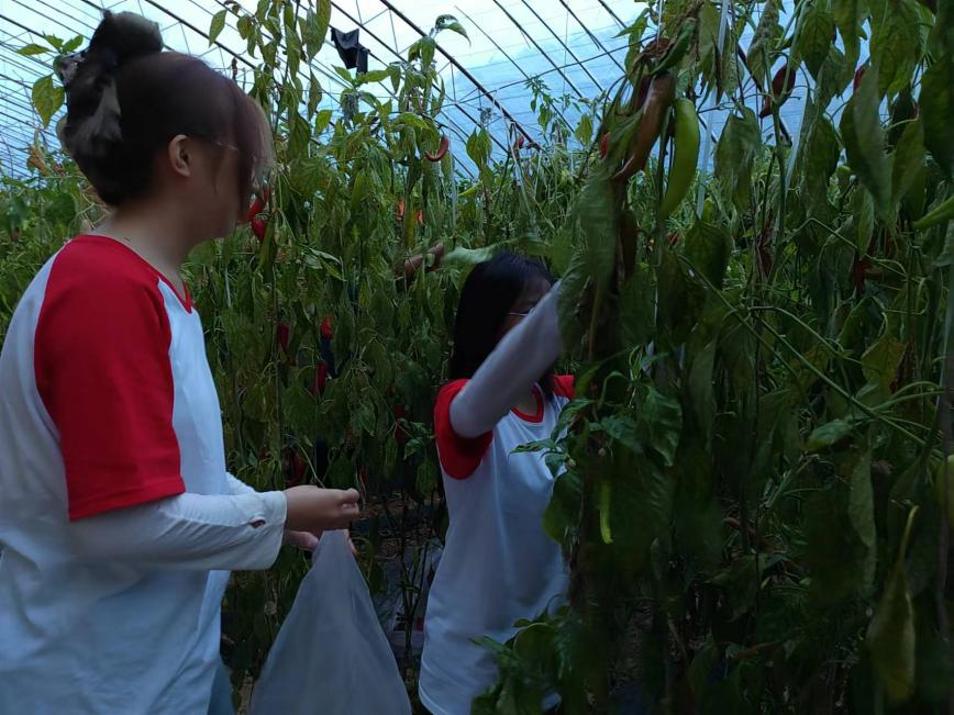 队员们的到来受到了村民的热忱欢迎,勤劳地在大棚中往来穿梭,跟着菜农一同采摘辣椒。起初采摘农作物的时候,队员对于农作物的辨别以及采摘的方法还不太明晰,但团队成员在旁边村民耐心地解说下,他们慢慢地变得熟练起来。
