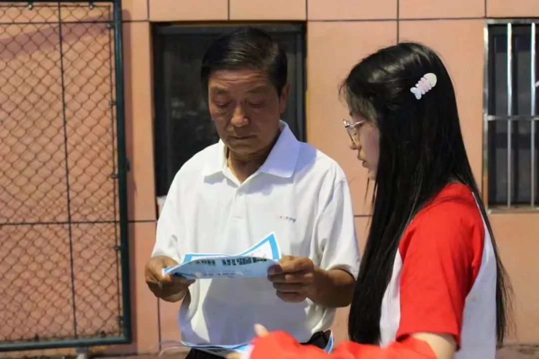 同学们认真地向一位阿姨讲解着。阿姨听后频频点头,说道: