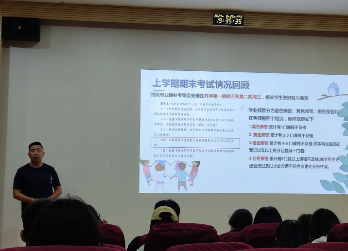本次班会,辅导员主要带领同学们进行上半年工作总结、收心教育与学风建设、新学期工作部署、健康生活及安全教育、特色专项工作交流、密切师生互动及学习贯彻落实党的二十届三中全会精神。