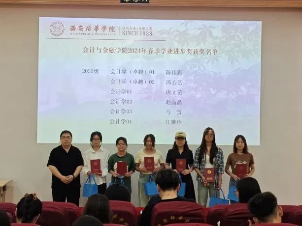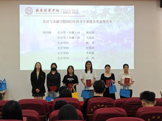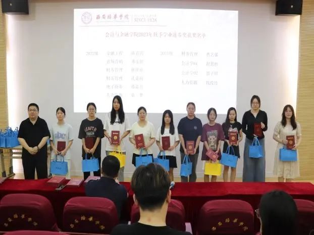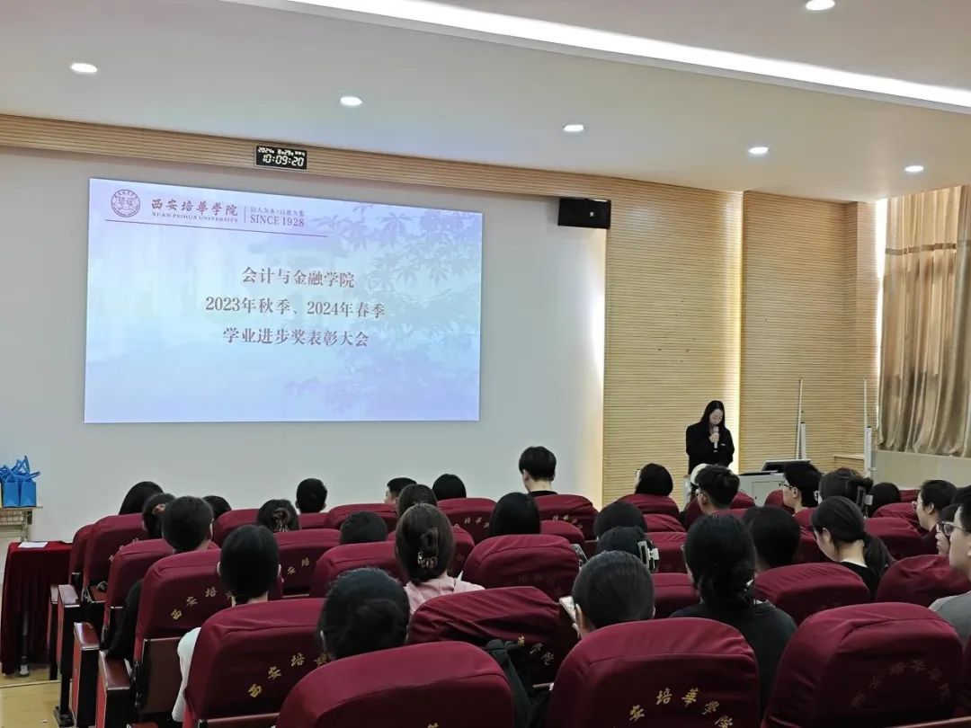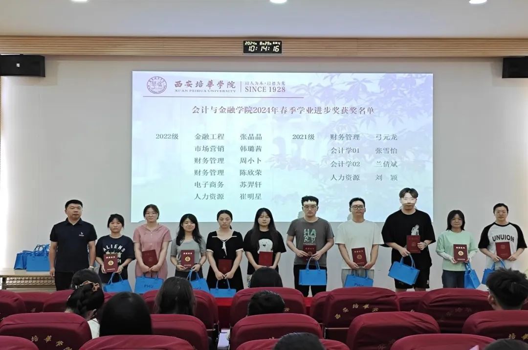 为表彰先进,树立学习典范,将学校关于养成学生自主学习的教育理念推广、推深。2024 年 8 月 29 日,会计与金融学院在阶梯教室 J201举行了2023 年秋、2024 年春学业进步奖表彰大会。