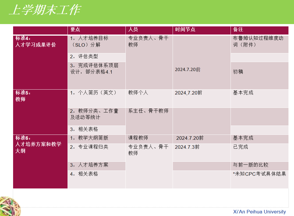 2024年9月7日,会计与金融学院举办了CPC考试在线发布会,除经济、管理、财会等知识外,增加IT内容,发布考前系统样题。上学期末,我院针对标准4(人才学习成果评价),标准5(教师),标准6(人才培养方案和教学大纲)进行了完善。近期学院的重点工作安排如下,首先要对上学期基础资料进行整理和完善,尤其是教师简历、课程大纲简版等模块;其次是需要对师资力量、人才培养方案及大纲等相关表格进行统计;最后,需完成认证会议记录原始资料的撰写。下一步工作的具体安排:2024年10月19日,前往苏州参加认证研讨会,2024年11月左右进行学生第2轮CPC考试,2024年12月左右进行学生、教师第2轮问卷调查。