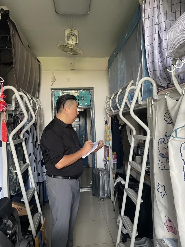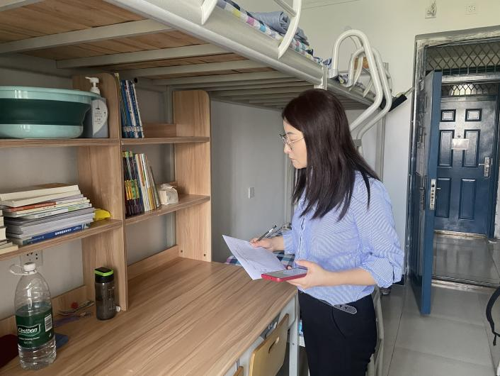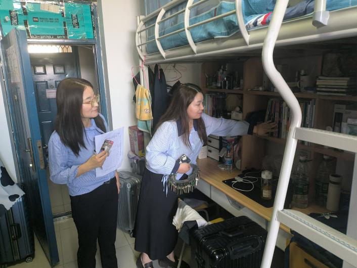 检查过程中,老师们走访了19号楼各个宿舍,与同学们亲切交流,了解他们的生活和学习情况并对宿舍卫生、安全进行检查。重点检查楼道区域是否有杂物及垃圾堆积、宿舍内通风情况、网络线路及日常用电安全、阳台物品存放等细节,从安全、卫生、整洁度、文化文明四个方面进行对学生宿舍进行全面整改,旨在确保学生尽快了解学生社区相关规定,避免出现各类安全隐患及卫生不达标问题。