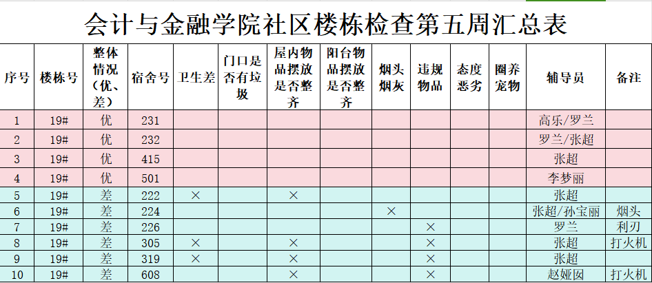现将本周检查情况反馈如下,本周共走访19号楼学生宿舍99间,其中优秀宿舍4间,占比4%;合格宿舍89间,占比90%,较差宿舍6间,占比6%。