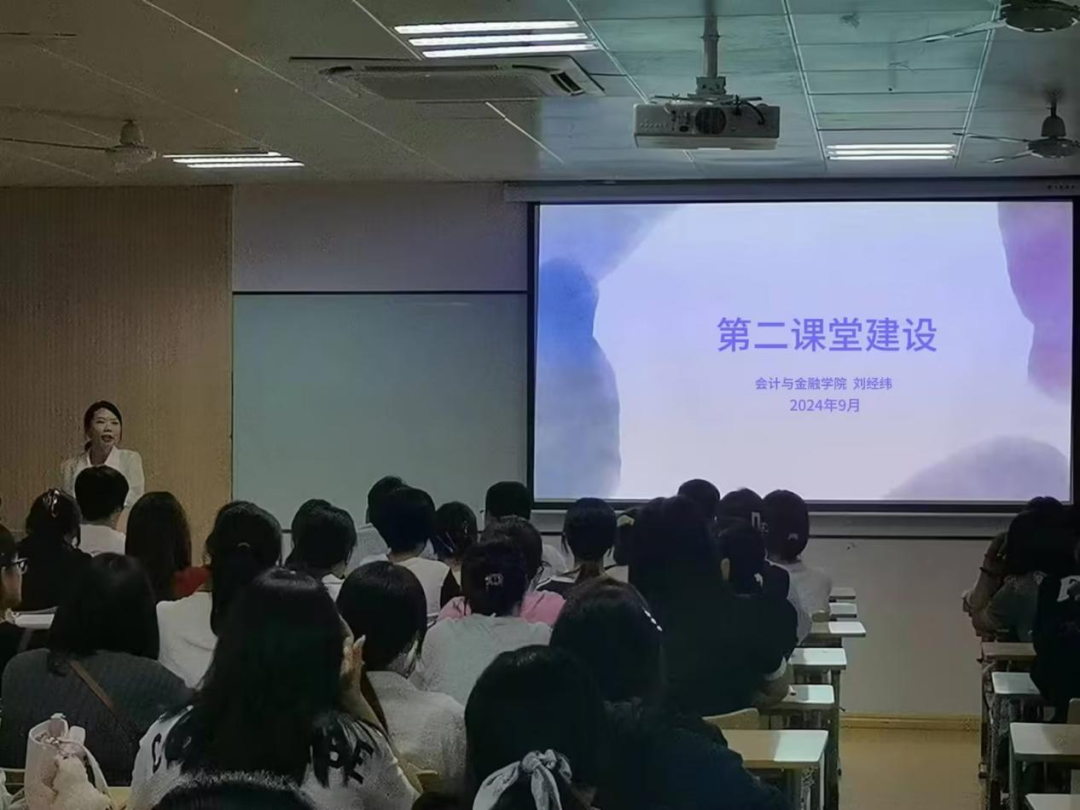 会计与金融学院9月下旬开展新生入学教育之第二课堂学分管理实施细则解析与新生团课专题教育,会计与金融学院2024级近千余名学生参加本次教育活动。 习近平总书记在全国高校思想政治工作会议上指出,要重视和加强第二课堂建设。第二课堂是第一课堂的有益补充,是对课程教学的延伸和拓展,是在校大学生拓展知识结构、开拓社会视野、增强实践能力、提高综合素质的有效途径,也是高校开展思政育人工作的主要阵地,两者共同构成更加完善的人才培养体系。共青团中央多次发文部署“第二课堂成绩单”制度的实施,规范引导第二课堂教学活动的开展。推进高校第二课堂建设,是构建“三全育人”工作新格局、落实立德树人根本任务的重要一环。会计与金融学院2024级辅导员赵娅囡、孙宝丽、刘经纬、乔安等四名老师作为主讲人对学校第二课堂学分管理细则及PU口袋校园平台进行了详细解读。