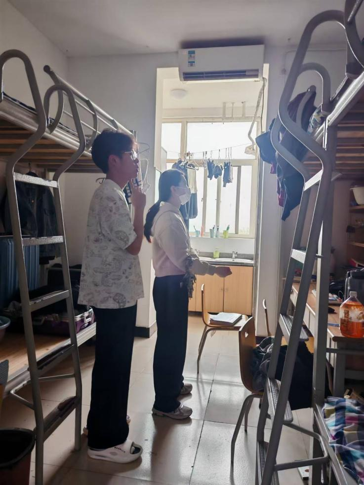 检查过程中,老师们走访了19号楼各个宿舍,对“五无五好”宿舍检查中发现的重点问题进行再次走访。重点检查楼道区域是否有杂物及垃圾堆积、宿舍内通风情况、网络线路及日常用电安全、阳台物品存放等细节,从安全、卫生、整洁度、文化文明四个方面进行对学生宿舍进行全面整改。