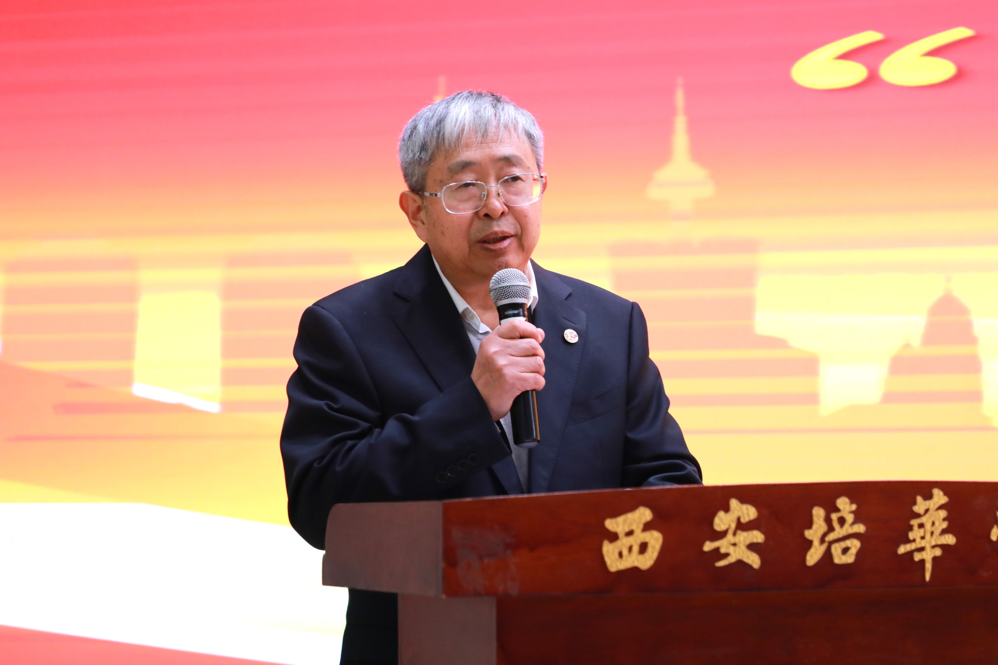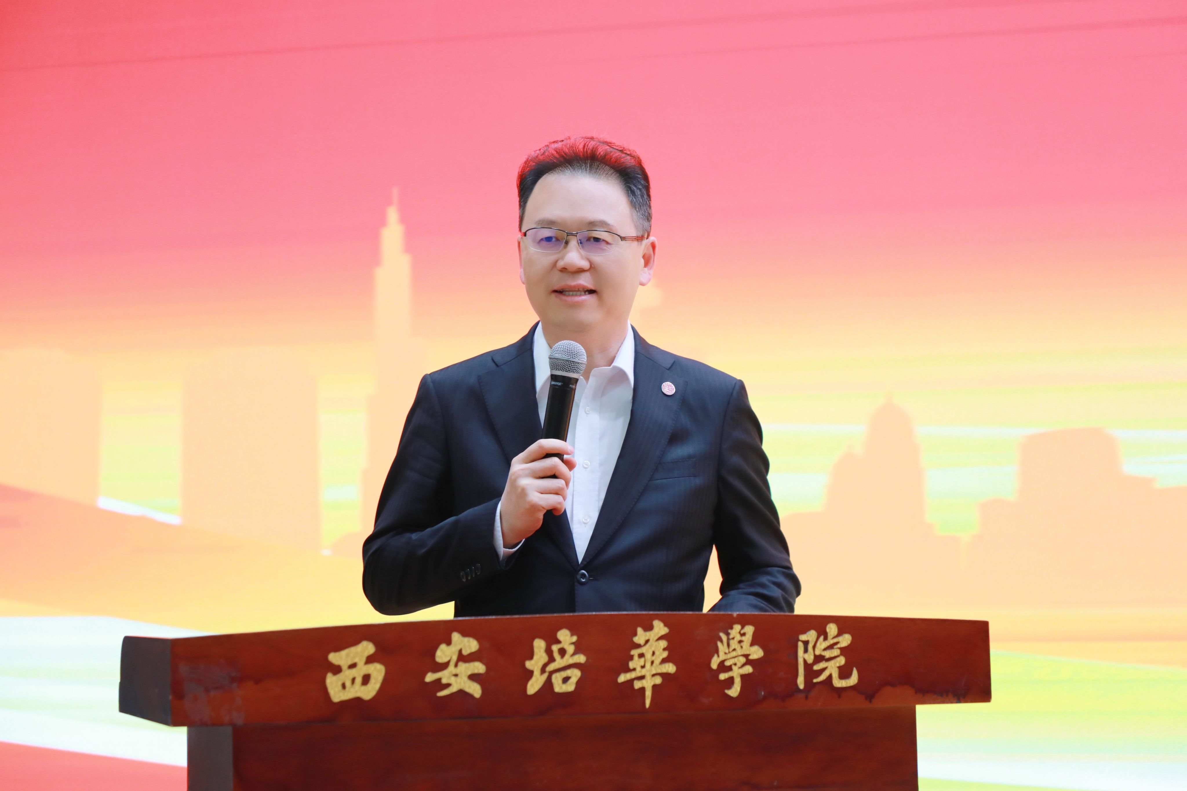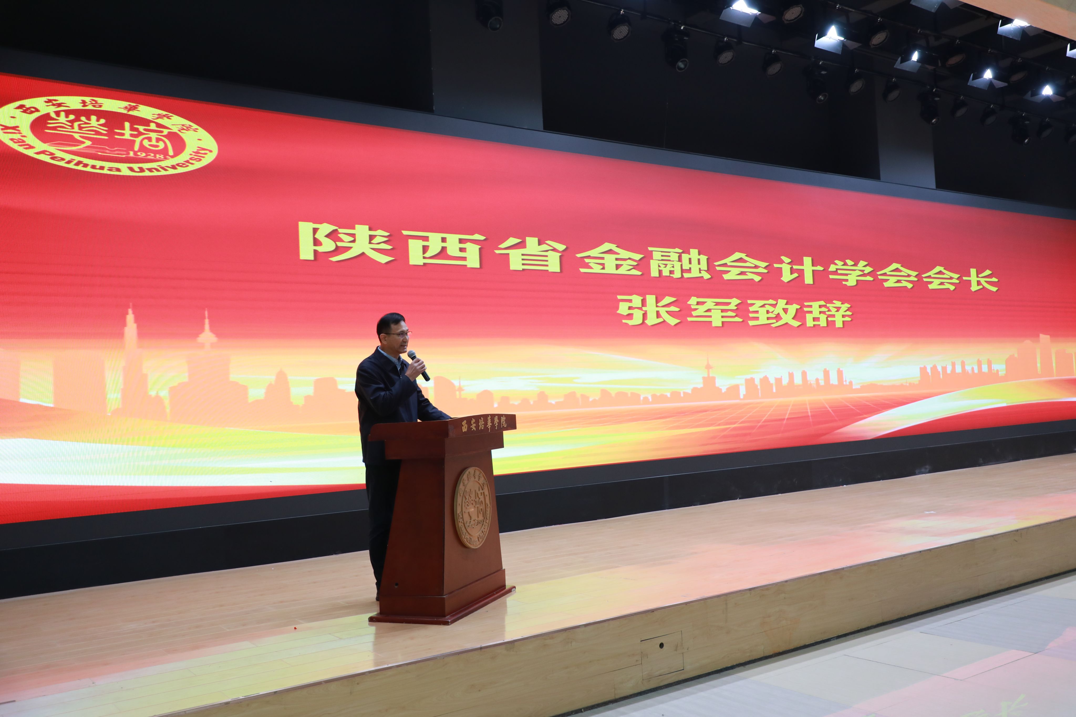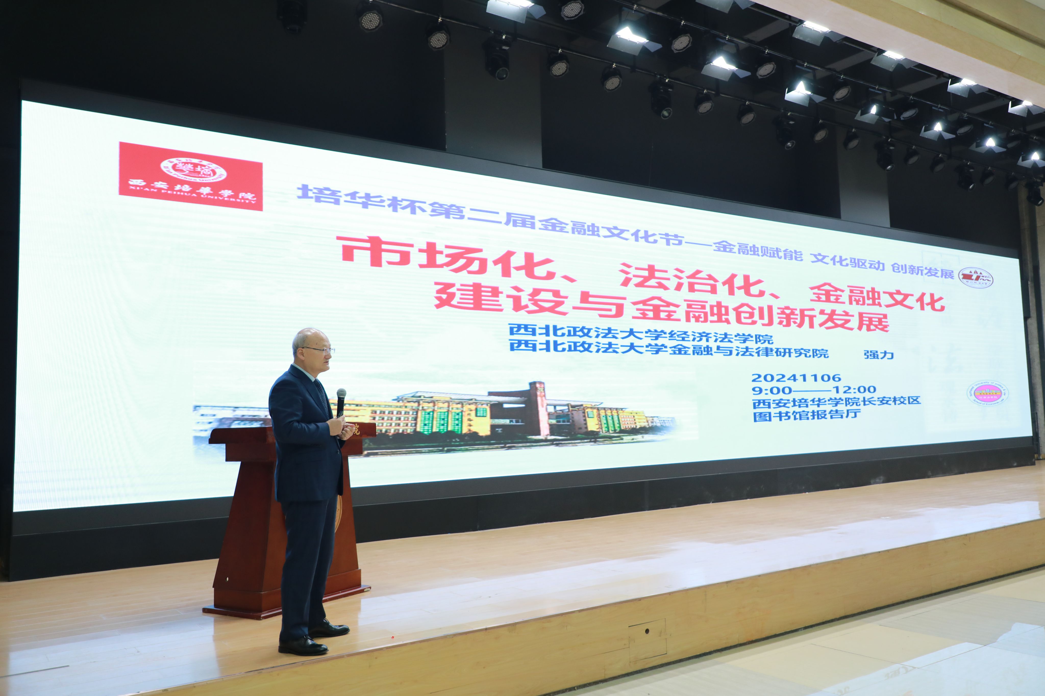 西安培华学院理事长姜波博士致辞。理事长介绍了学校发展历程中,为助力大西北全面建设,缓解经济工作对金融人才的急需所开启的对财经、金融人才的培养工作。他期望通过"培华杯"第二届金融文化节系列活动的开展,持续推进我校财金人才的高质量培养,深入探索金融文化的传播、金融法治的建设、金融事业的发展之路。