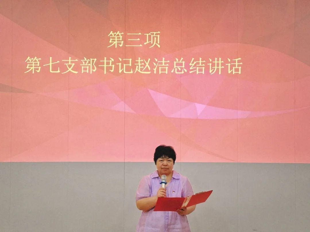 活动最后,第七学生党支部书记赵洁老师对本次活动进行总结点评,她表示选手在台上举止得体、神态自信,展现出良好的精神风貌,用充满热情与活力的情绪感染听众。也能看出他们对党的忠诚和热爱溢于言表,能深刻领会党的精神并坚定传播。她强调了学生党员在新时代的责任和使命,鼓励大家要不断学习党的知识,提高自身素质,以实际行动迎接党的诞辰,为实现中华民族伟大复兴的中国梦贡献青春力量。